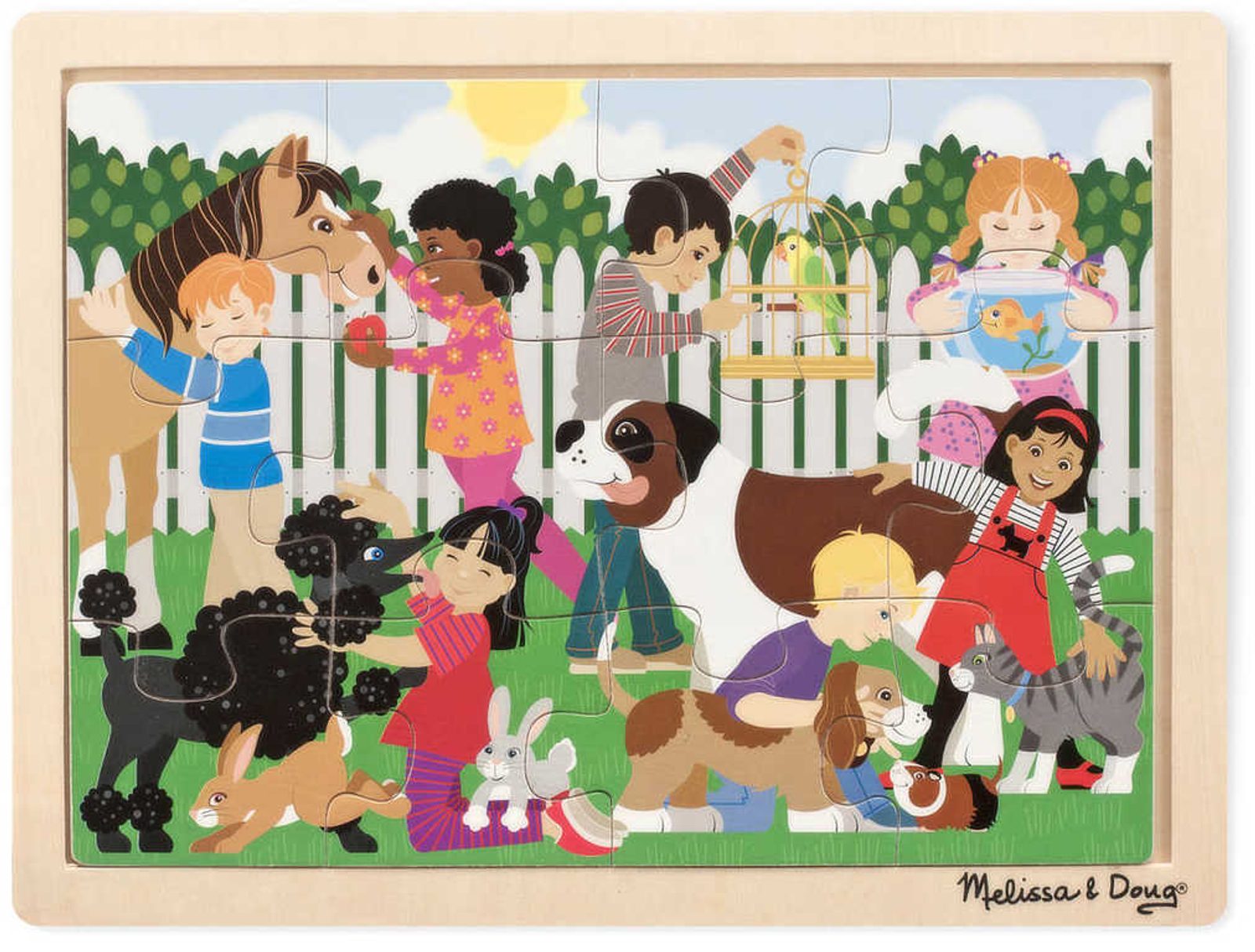 Sestav 12 dílů dřevěných puzzlí s obrázkem dětí a zvířat. Puzzle skládačka na desce rozvíjí dětskou motoriku a stimuluje logické myšlení.