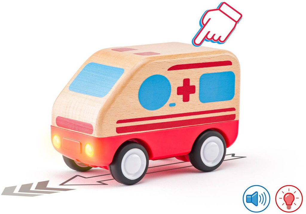 WOODY DŘEVO Auto baby sanitka na setrvačník na baterie Světlo Zvuk