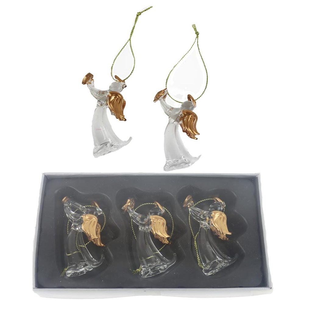 Sada dekoračních andílků k zavěšení. Sada obsahuje 3 andílky. Rozměry : 3 x 3 cm, výška 6,5 cm. Barva : čiré sklo, zlatá. Materiál : sklo.