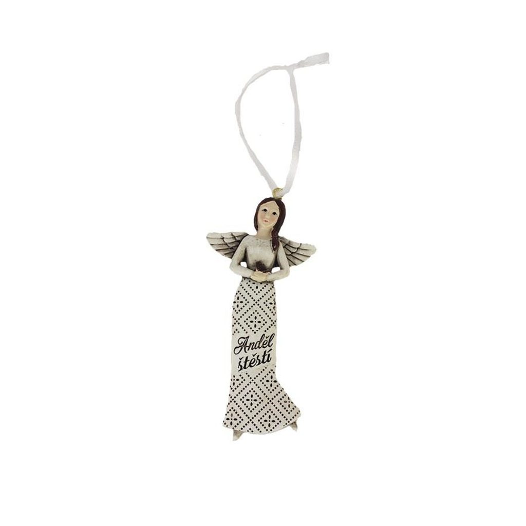 Dekorační anděl k zavěšení. Rozměry : 5,5 x 0,8 cm, výška 12 cm. Barva : kombinace bílá s hnědou. Materiál : polyresin.