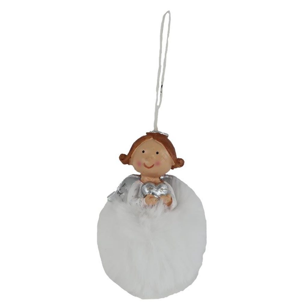 Dekorační anděl k zavěšení. Rozměry : 7,3 x 7,3 cm, výška 10 xm. Barva : kombinace bílá se stříbrnou. Materiál : polyresin, textil.