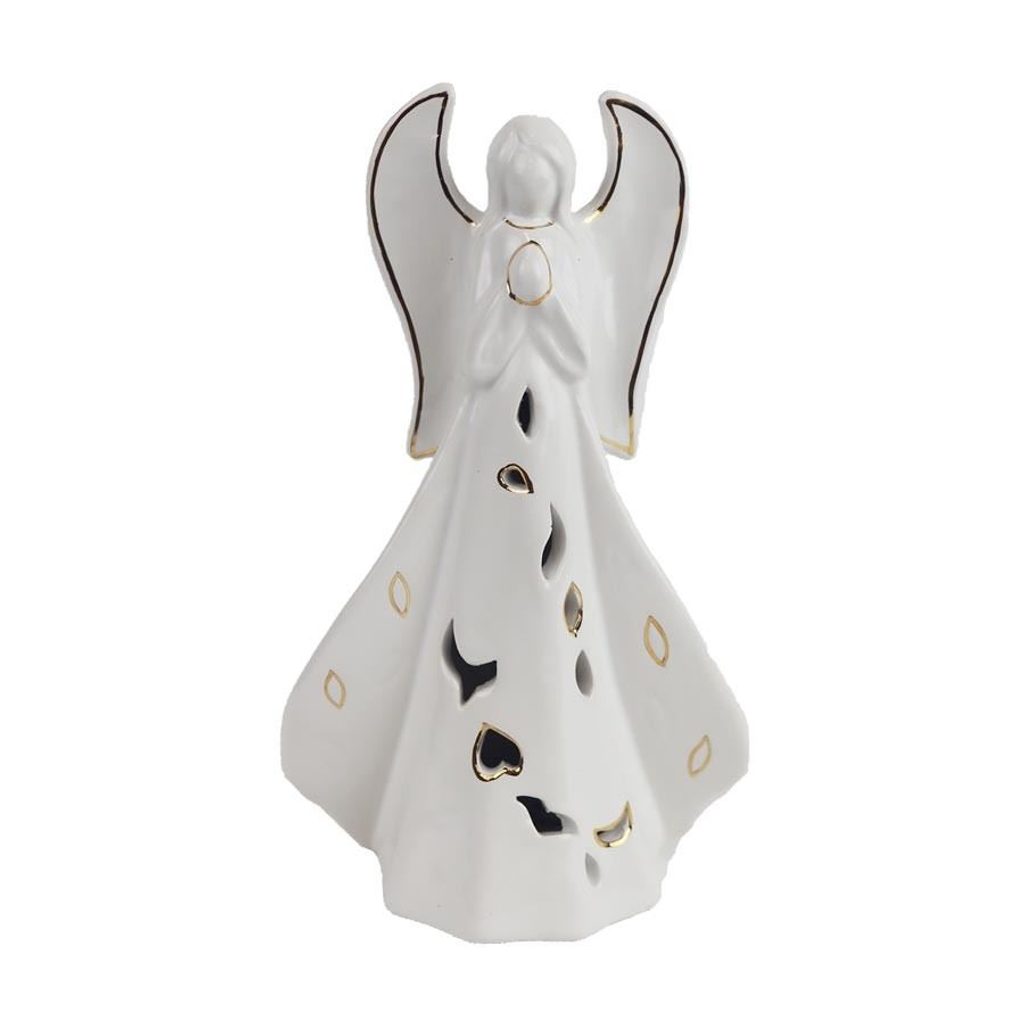 Dekorační anděl s LED osvětlením. 2 x baterie LR44 je součástí výrobku. Třída ochrany: IP20 (vnitřní použití). Rozměry : 8,5 × 5,5 cm, výška 15 cm. Barva : kombinace bílá se zlatou. Materiál : keramika.