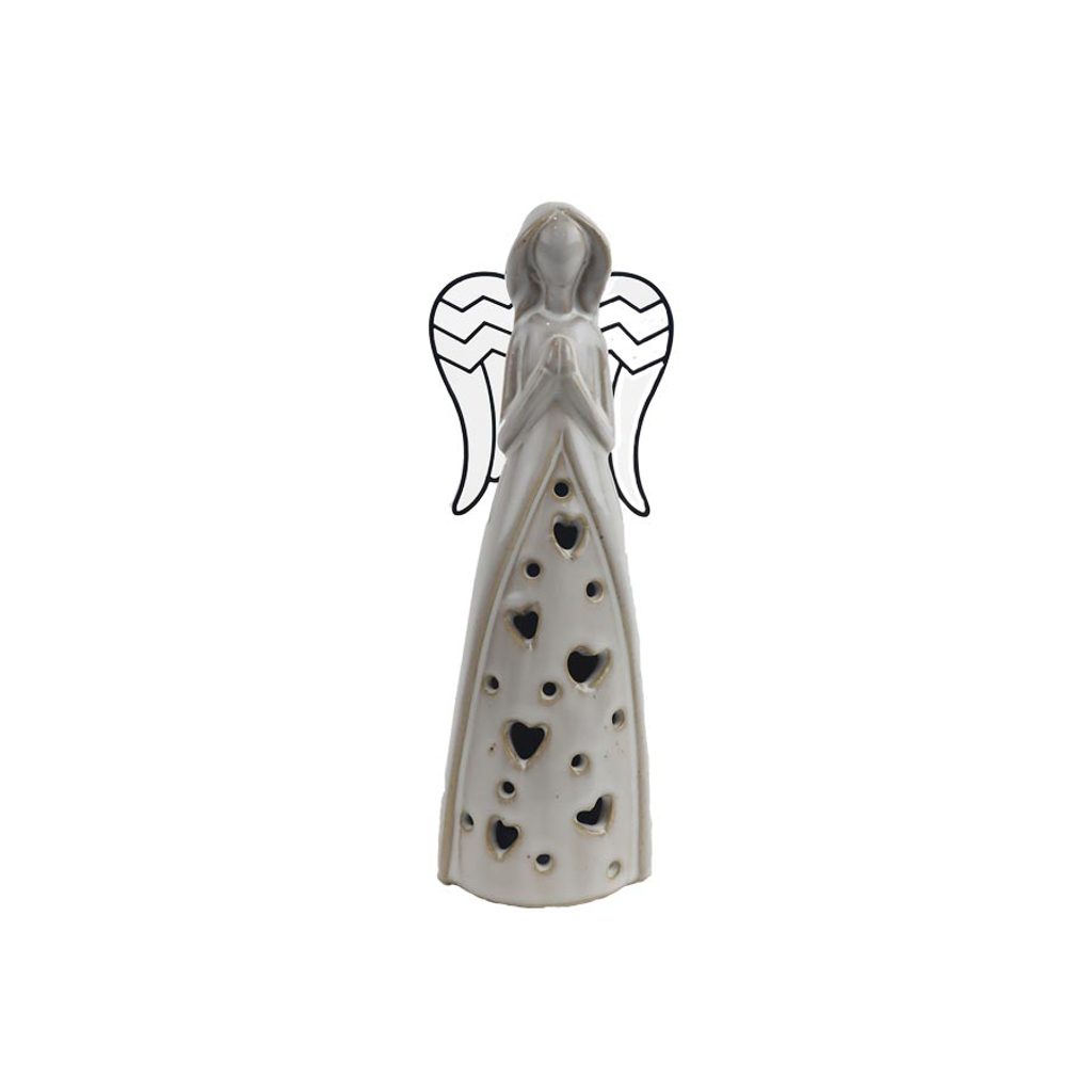 Dekorační anděl s LED osvětlením. Dekorace obsahuje 2x baterie LR44. Rozměry : 9,3 × 6,3 cm, výška 22,2 cm. Barva : kombinace bílá, hnědá. Materiál : keramika, kov.