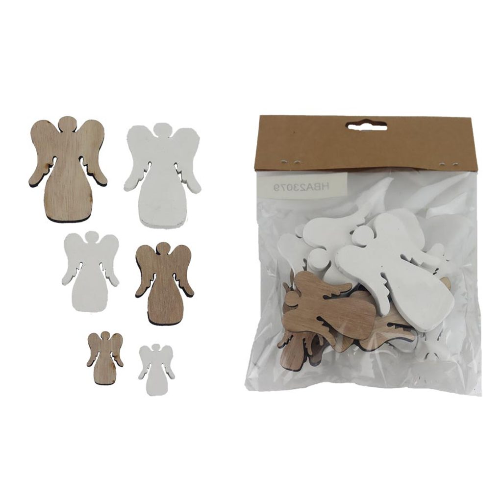 Sada dekoračních andílků. Sada obsahuje 18 andílků o třech velikostech. Rozměry : 2 - 4,5 x 0,5 cm, výška 2,8 - 6,5 cm. Barva : hnědá, šedá, bílá. Materiál na bázi dřeva.
