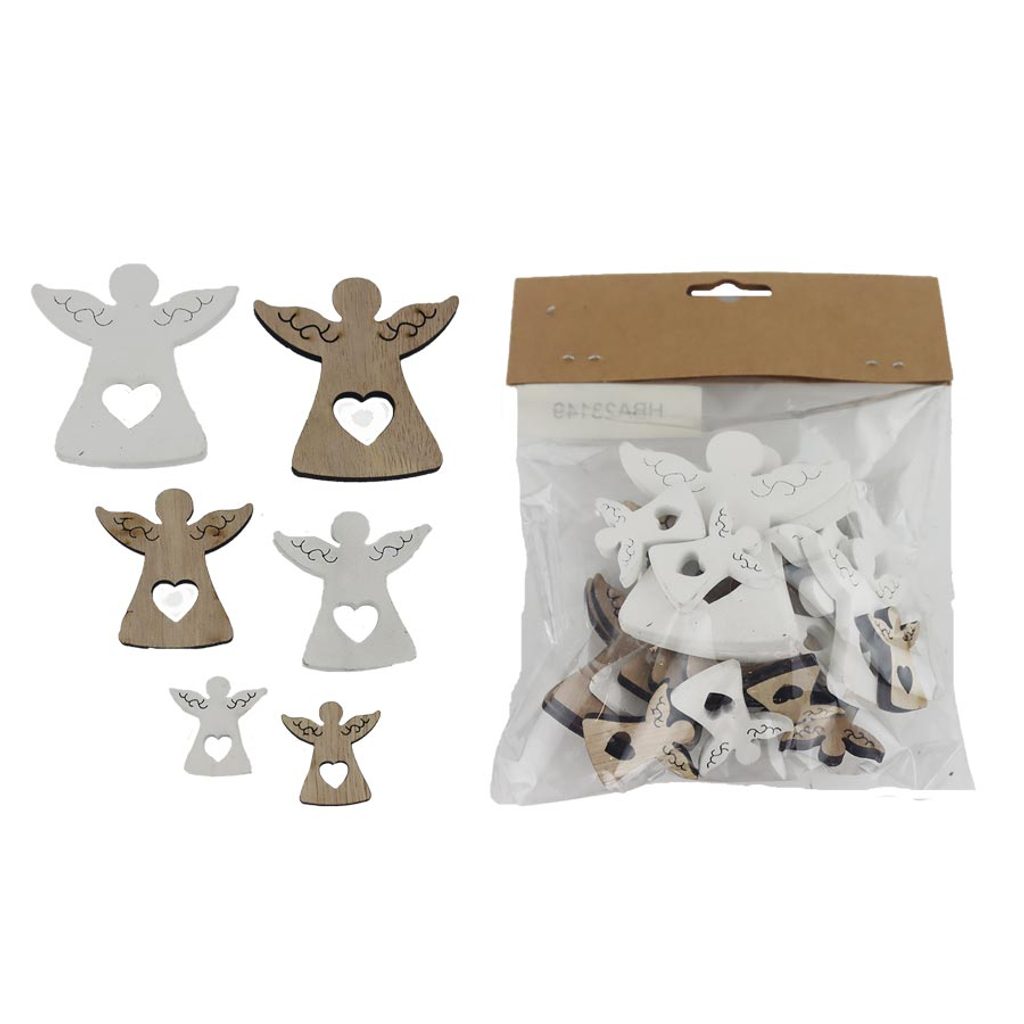 Sada dekoračních andílků. Sada obsahuje 18 andílků o třech velikostech. Rozměry : 2,8 - 6,5 x 0,5 cm, výška 3 - 7 cm. Barva : kombinace hnědá, bílá. Materiál na bázi dřeva.