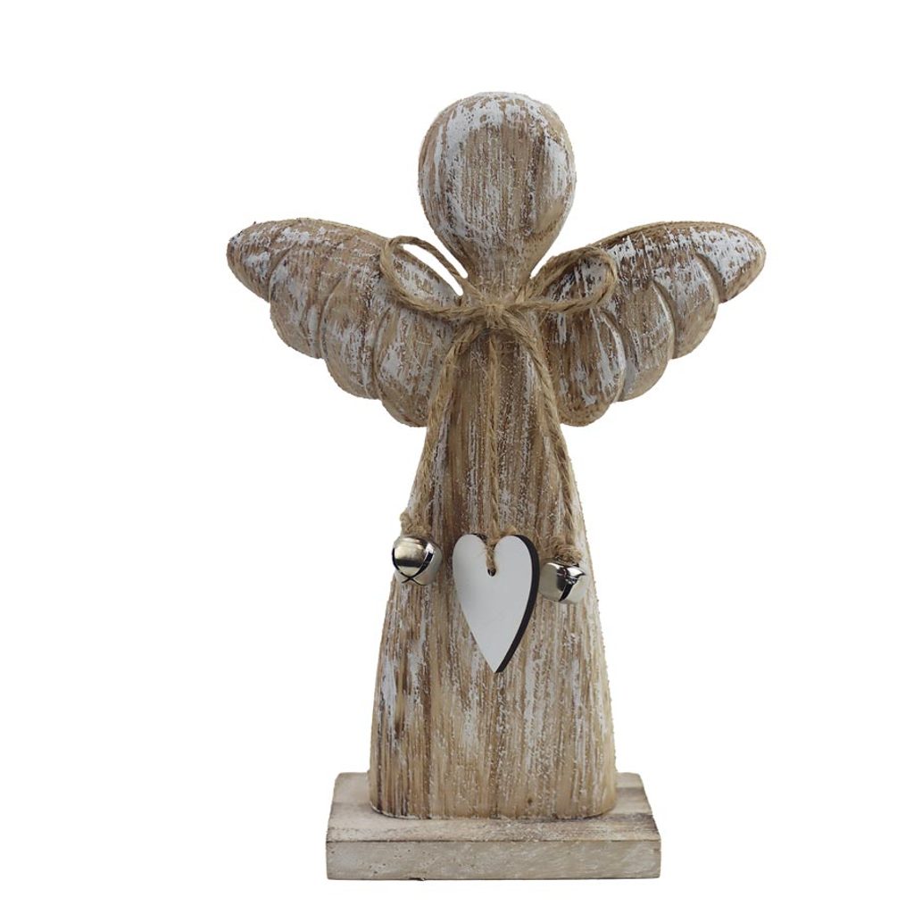 Dekorační anděl se srdíčkem. Rozměry : 17,5 × 5 cm, výška 25,5 cm. Barva : kombinace přírodní s bílou. Materiál na bázi dřeva.