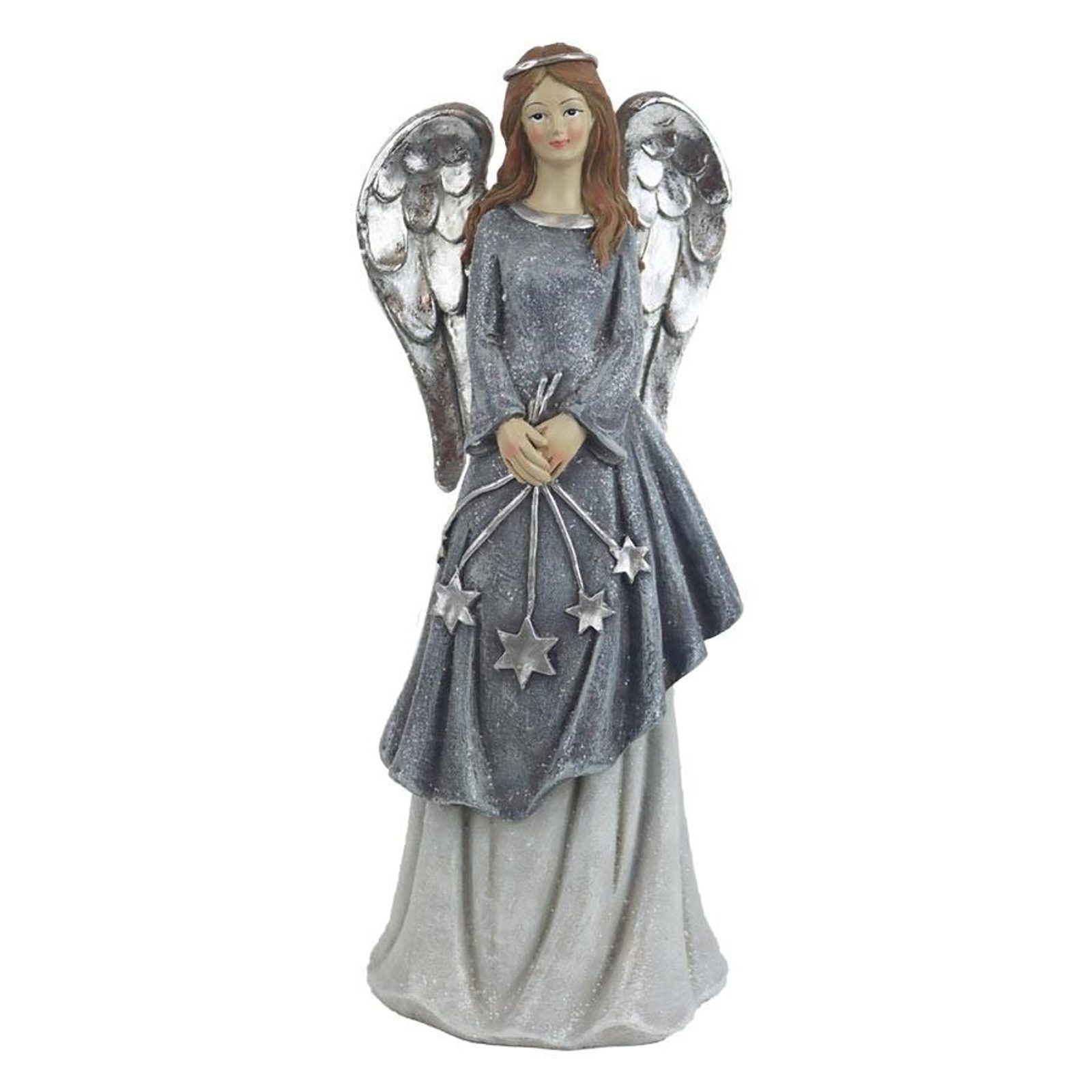 Dekorační anděl. Rozměry : 10 × 8 cm, výška 25,5 cm. Barva : kombinace šedá se stříbrnou. Materiál : polyresin.Rozměr: 10 × 8 × 25,5 cm
