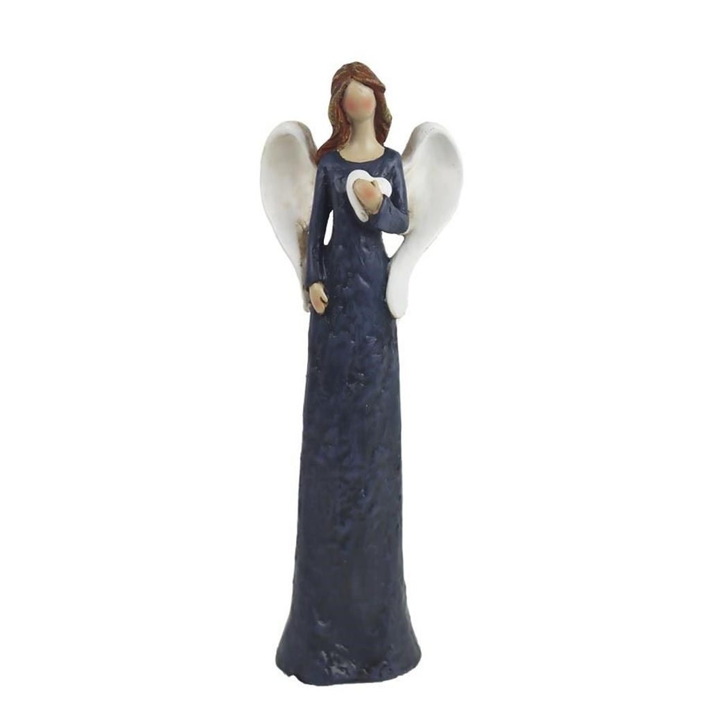 Dekorační anděl. Rozměry : 6 × 3,5 cm, výška 17,5 cm. Barva : kombinace modrá s bílou. Materiál : polyresin.Rozměr: 6 × 3,5 × 17,5 cm