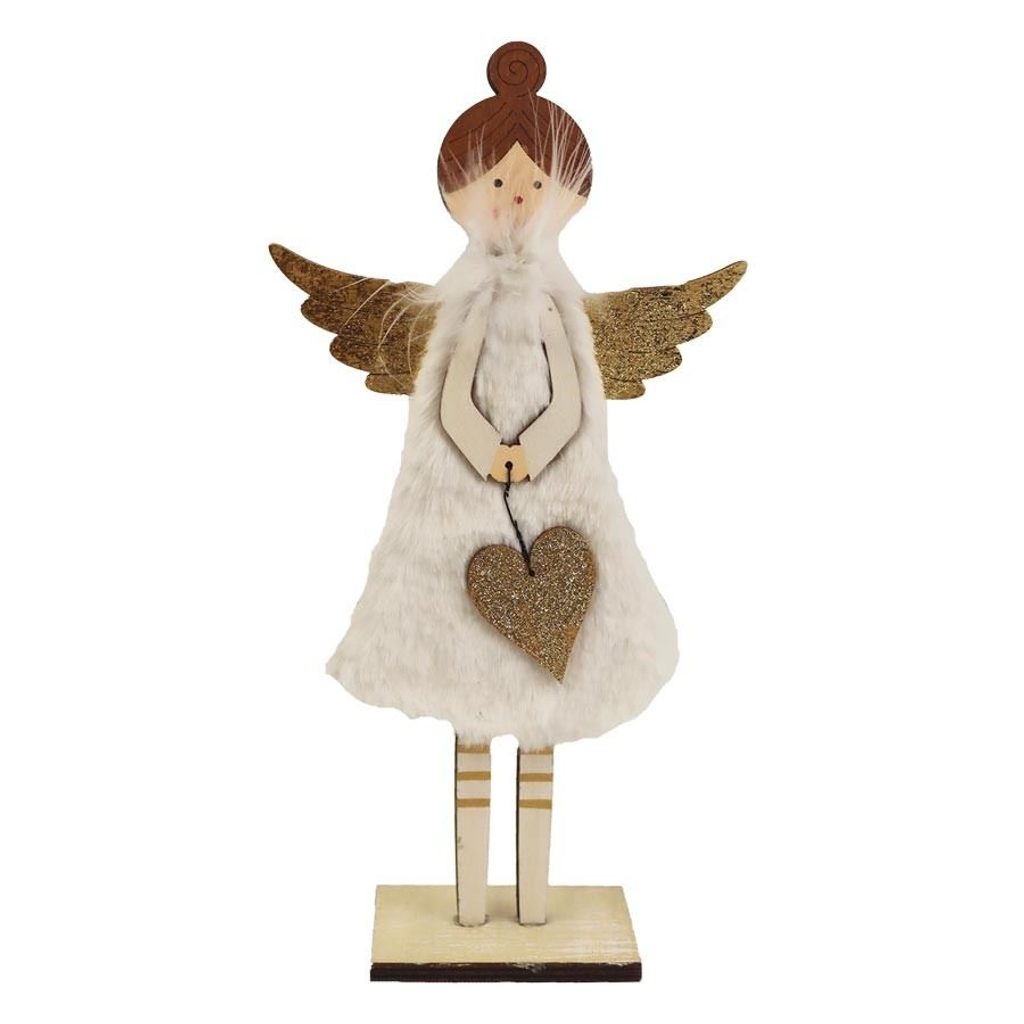 Dekorační anděl. Rozměry :12,5 x 4,5 cm, výška 25 cm. Barva : kombinace bílá, zlatá, přírodní. Materiál na bázi dřeva, kov, textil.