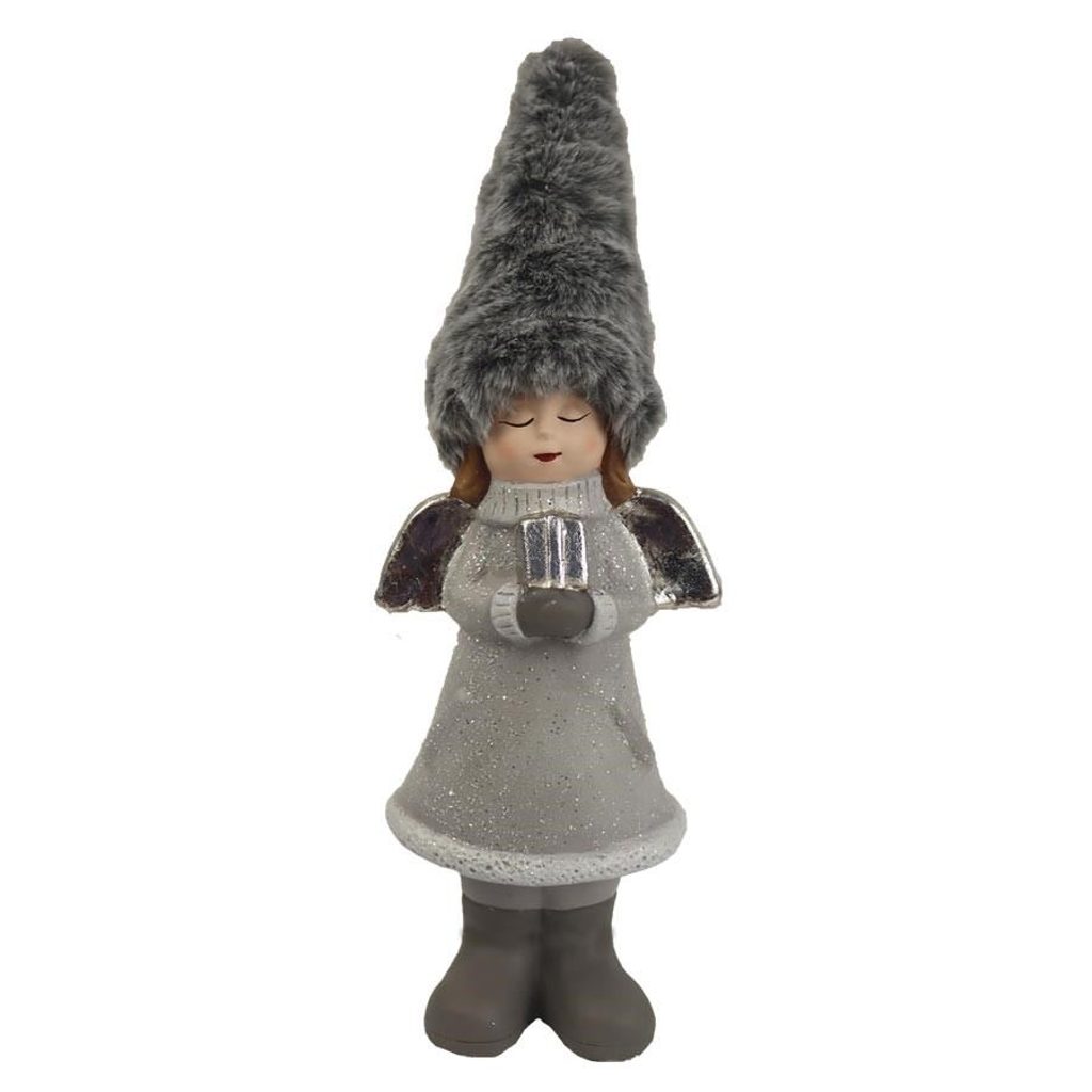 Dekorační anděl. Rozměry : 9,5 x 7 cm, výška 19,5 cm. Barva : kombinace šedá se stříbrnou. Materiál : polyresin.Rozměr: 9.5 x 7 x 19.5 cm