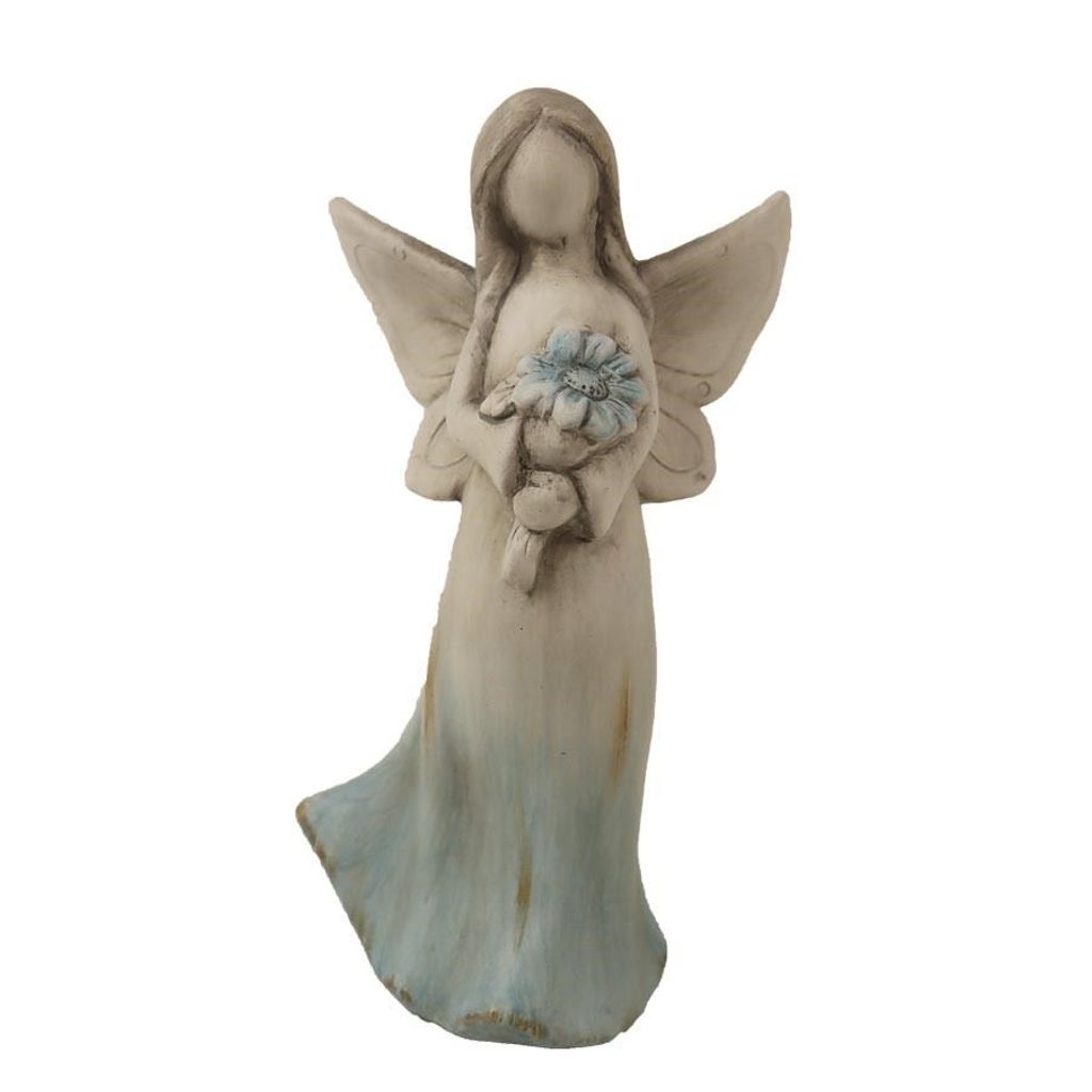 Dekorační anděl. Rozměry : 11 × 8.5 cm, výška 21 cm. Barva : kombinace šedá s modrou. Materiál : keramika.Rozměr: 11 × 8.5 × 21 cm