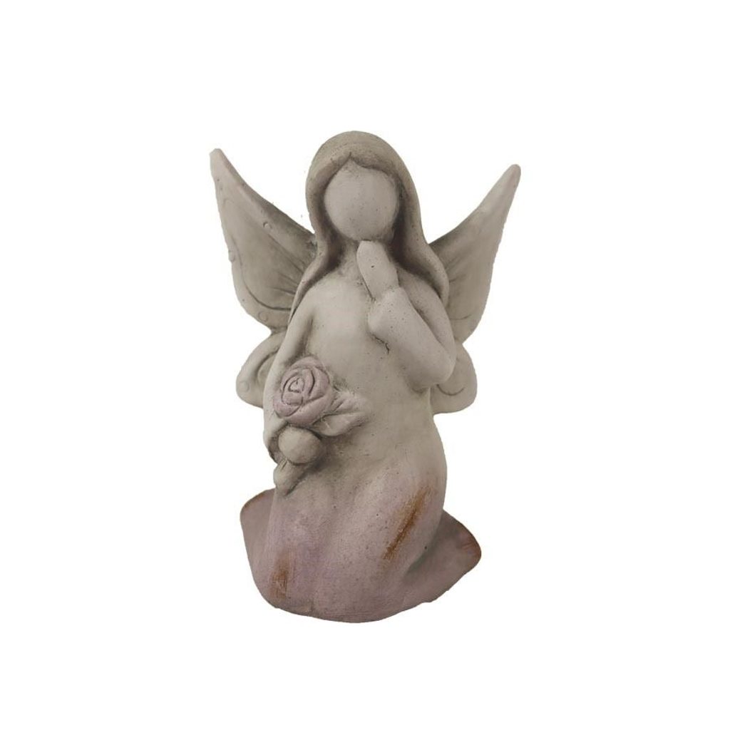 Dekorační anděl. Rozměry : 8,5 × 8.5 cm, výška 13 cm. Barva : kombinace šedá s růžovou. Materiál : keramika.Rozměr: 8.5 × 8.5 × 13 cm