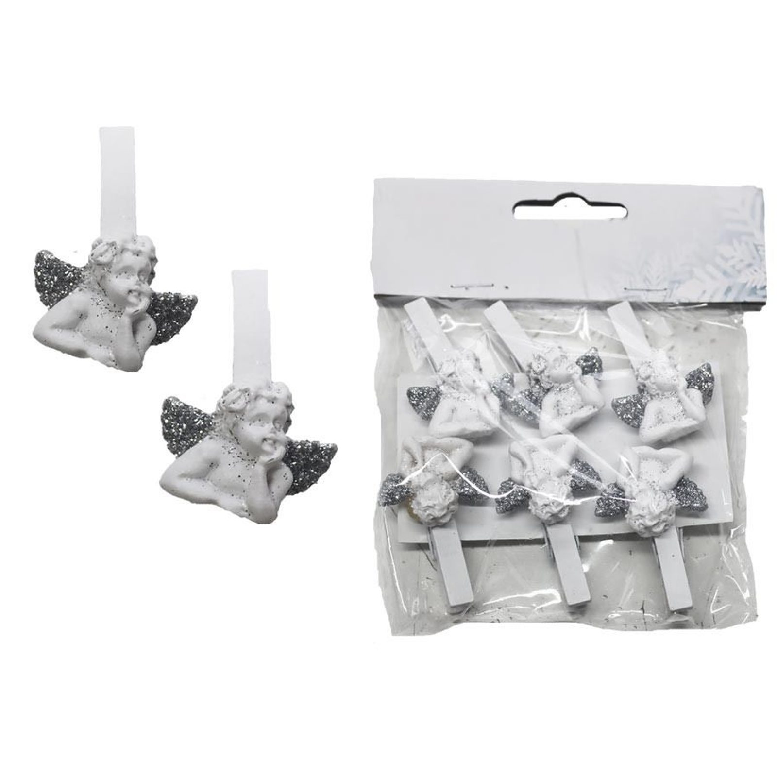 Sada dekoračních klipů - anděl. Sada obsahuje 6 klipů. Rozměry : 3,5 x 4,5 cm, výška 2,3 cm. Barva : kombinace bílá se stříbrnou. Materiál : polyresin, dřevo.