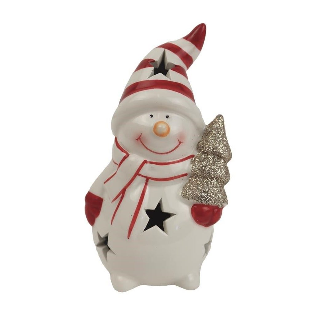 Dekorační sněhulák s LED osvětlením. Rozměry : 7,5 x 6,5 cm, výška 13 cm. Barva : kombinace bílá s červenou. Materiál : keramika.