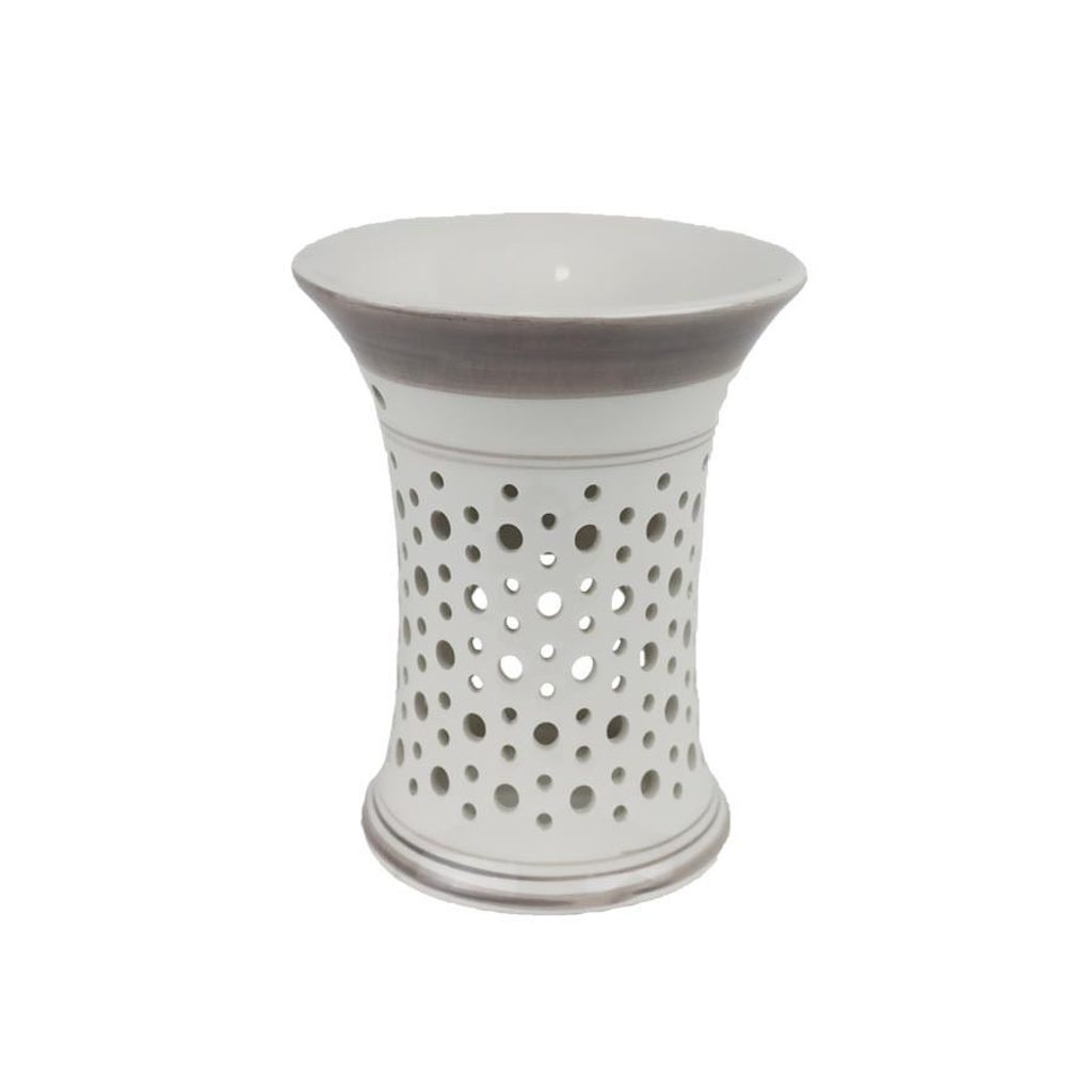 Krásná aromalampa. Aromalampa je výborná pro odpařování éterických olejů rozpuštěných ve vodě či voskových aromakapslí. Aromalampa poslouží nejenom jako difuzér pro osvěžení vzduchu, ale také je pěknou vkusnou dekorací do každého interiéru. Rozměry : průměr 12,5 cm, výška 15,5 cm. Barva : kombinace bílá s šedou. Materiál : dolomit.