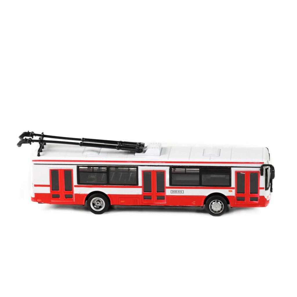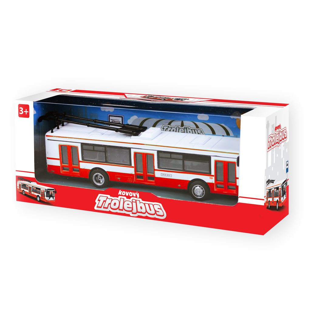 Parádní kovový trolejbus, který jezdí na zpětný chod je unikátní hračkou, která nadchne všechny malé i velké fanoušky trolejbusů. Trolejbus je dlouhý 16 cm, v bílo-červeném provedení.
