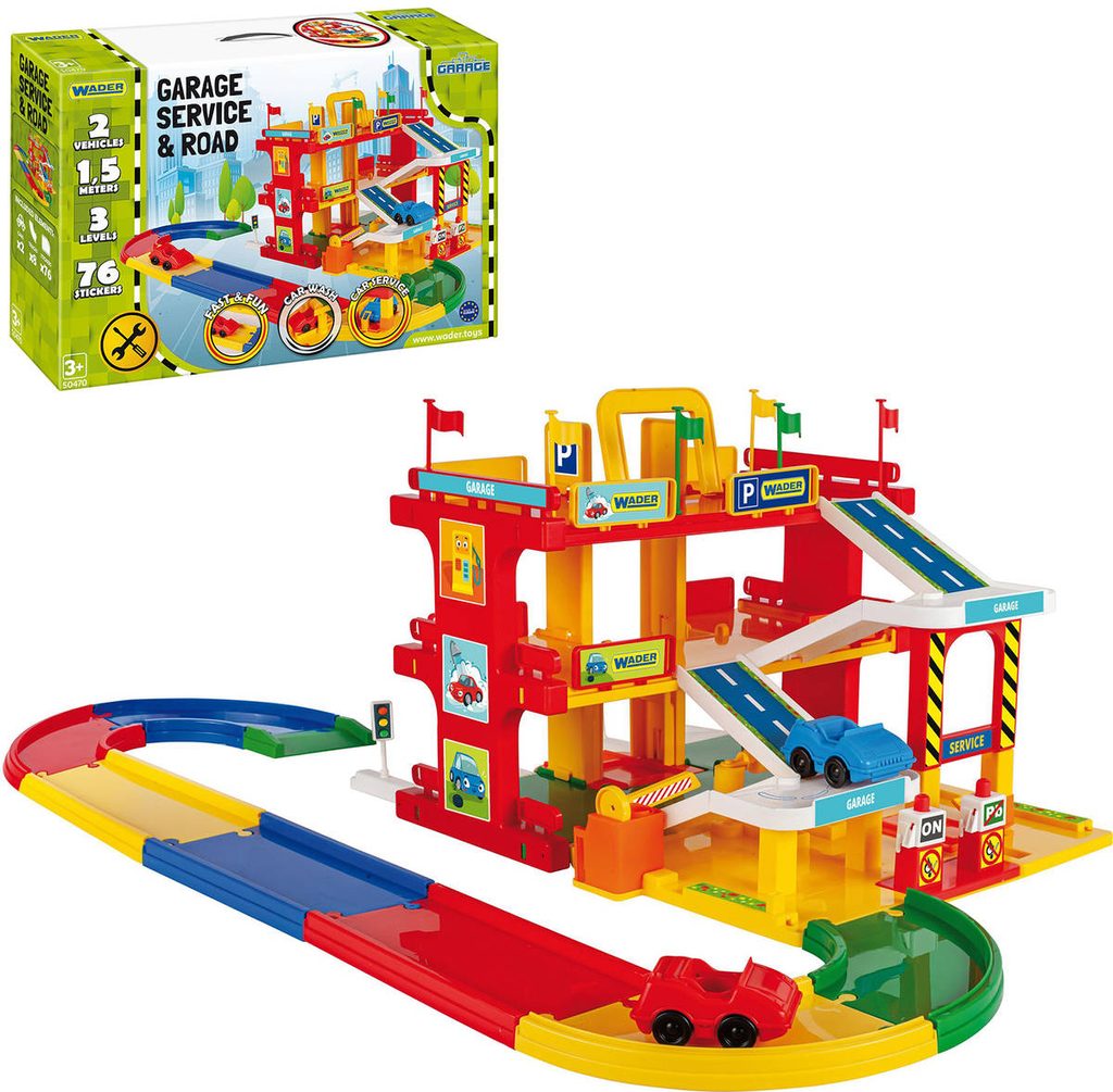 Trojposchoďová garáž s výtahem pro osobáky, točitou rampou, automyčkou a kvalitním kovovým modelem auta v měřítku 1:43.