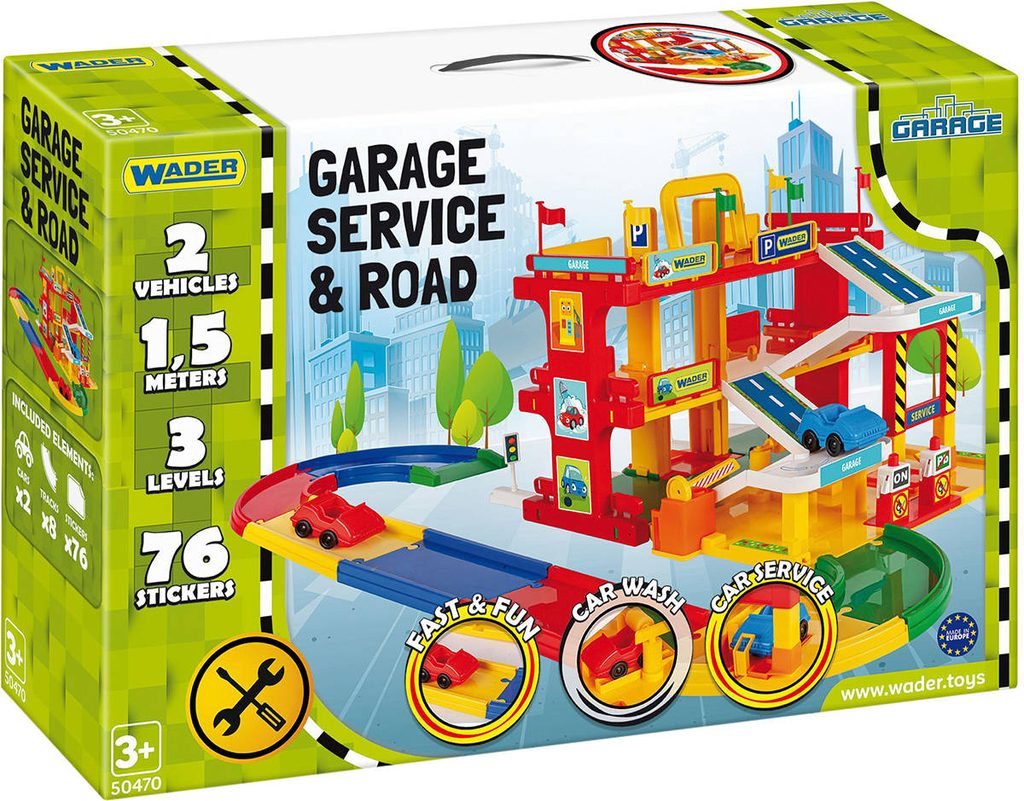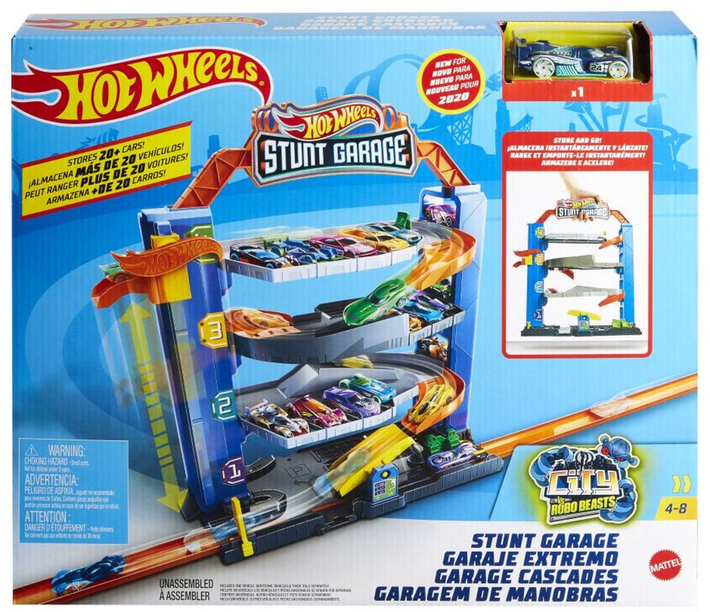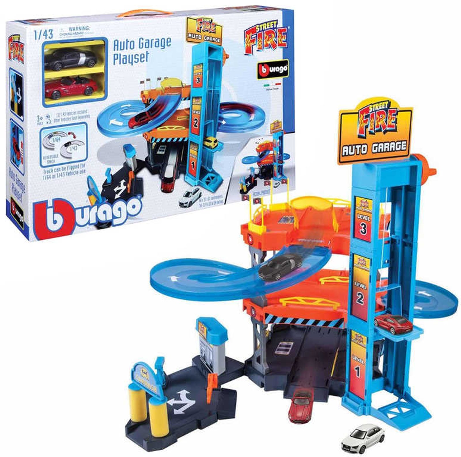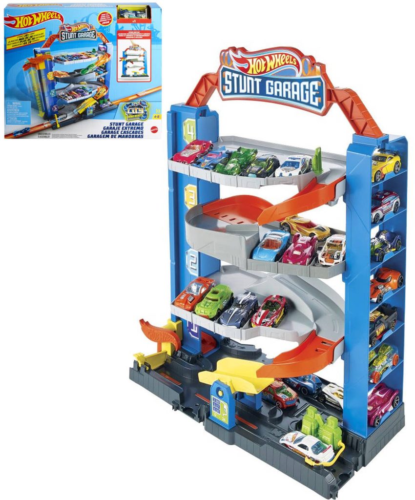 Třípatrová garáž Street Fire Downhill s mnoha barevnými doplňky, mechanickým výtahem, čerpací stanicí a automyčkou je snem každého malého řidiče! Díky obsažené dvojici autíček v měřítku 1:43 mohou děti