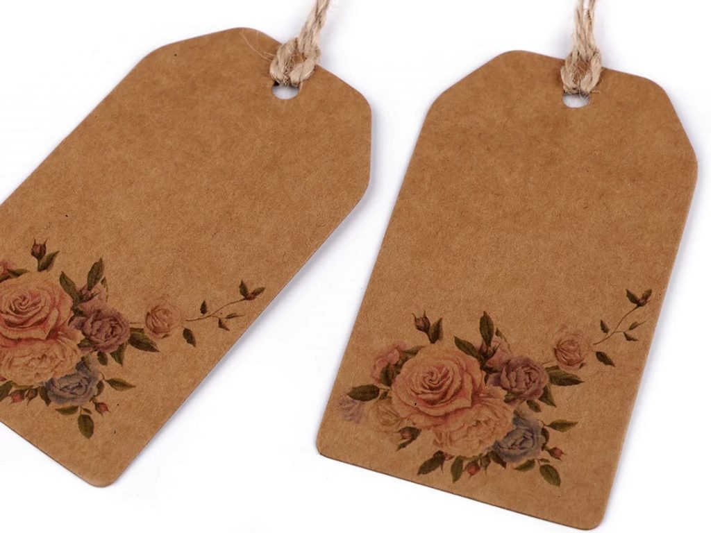 Visačka č.2 - s potiskem růží, má šňůrku z přírodní juty.
