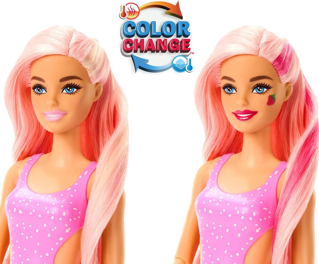 Panenka Barbie Pop Reveal potěší děti tematikou šťavnatého ovoce a novým zážitkem při rozbalování, kdy pomocí slizu odhalí překvapení, mezi něž patří panenka Barbie s vůní ovoce a kostky ledu, které při prasknutí odhalí další překvapení. Set obsahuje heboučké voňavé zvířátko, tematické doplňky a hru se změnou barev. Všechny čtyři panenky z edice Pop Reveal Šťavnaté ovoce se liší vzhledem, druhem ovoce a barevným provedením, a i s doplňky jsou skryté v limonádových kelímcích s víčkem. Panenky se prodávají zvlášť v závislosti na dostupnosti. Panenka nemůže stát samostatně. Barvy a provedení dekorací se mohou lišit.Barbie je světově nejznámější a nejprodávanější panenka. Tuto populární panenku vyrábí společnost Mattel. Většina panenek Barbie a jejich příslušenství je vyráběna v poměru přibližně 1:6. Vynálezkyní panenky Barbie byla paní Ruth Handlerová. Vytvořila jí pro svou dceru Barbarru, po které panenku také pojmenovala. Barbie má romantický vztah se svým přítelem Kenem (Ken Carson), který se po jejím boku poprvé objevil již v roce 1961 v televizní reklamě.