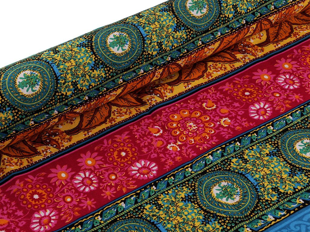 Bavlněné plátno s orientálními vzory má řidší tkanou vazbu, díky které je na dotek měkčí. Můžete z něj ušít oděvy (šaty, sukně), šátky, plédy, pytlíky, tašky, závěsy a různé bytové doplňky.- Šíře:: 150 cm