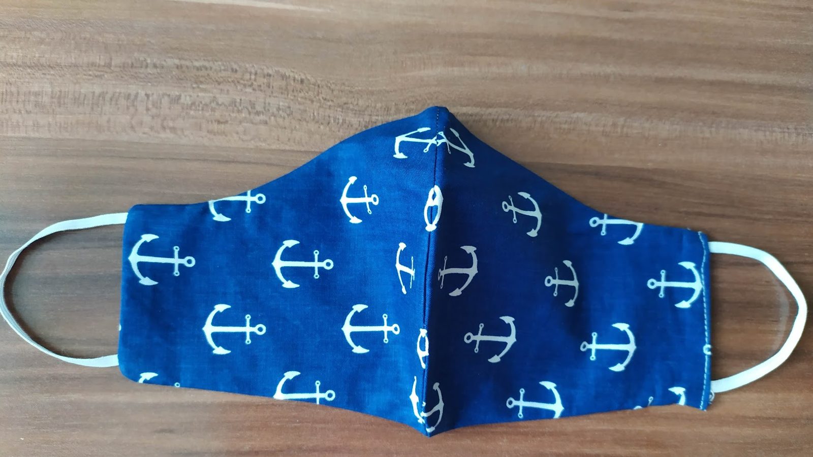 Dvouvrstvá bavlněná rouška v modré barvě s potiskem kotviček na gumičku od české firmy Vestis. Rouška s námořním potiskem.