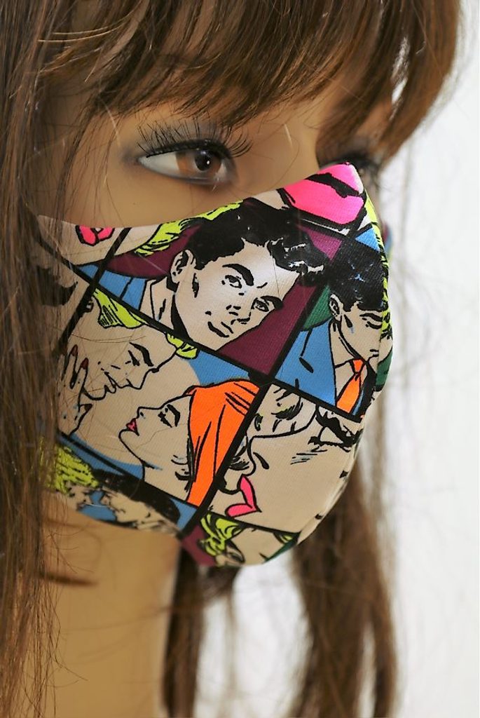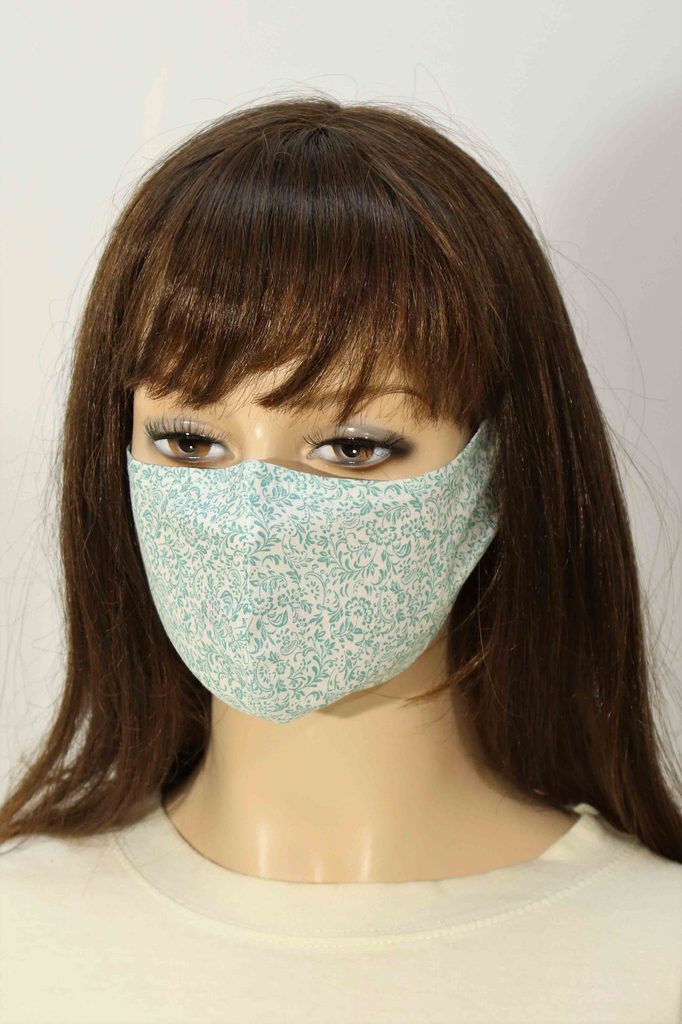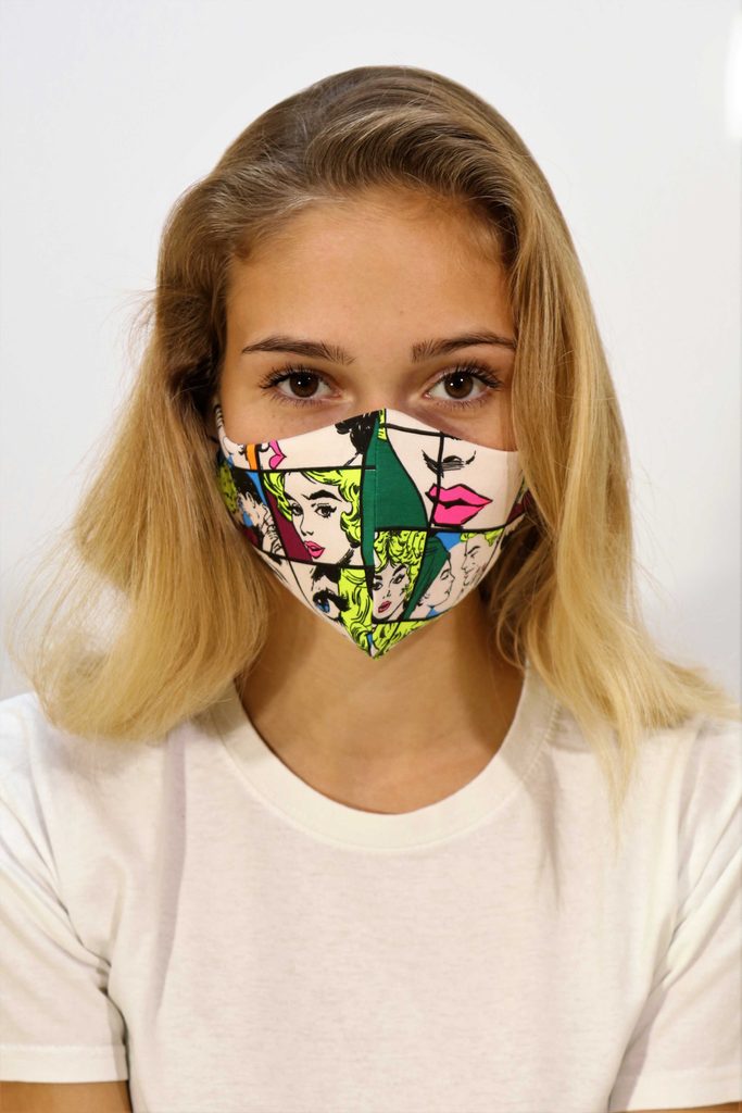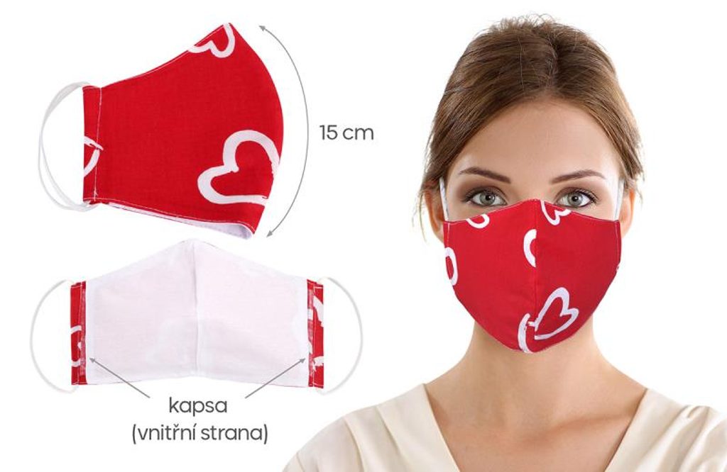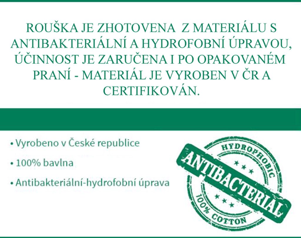 Dvě vrstvy bavlny, vrchní látka je barevná, vnitřní strana je z bílé bavlny.Mezi tyto dvě vrstvy je možné vložit filtr. Rouška chrání před šířením infekce, praní na 60C°