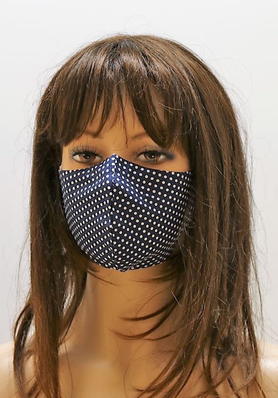 Dvouvrstvá bavlněná rouška na gumičku od české firmy Vestis v tmavě modré barvě s potiskem stále oblíbených puntíků.