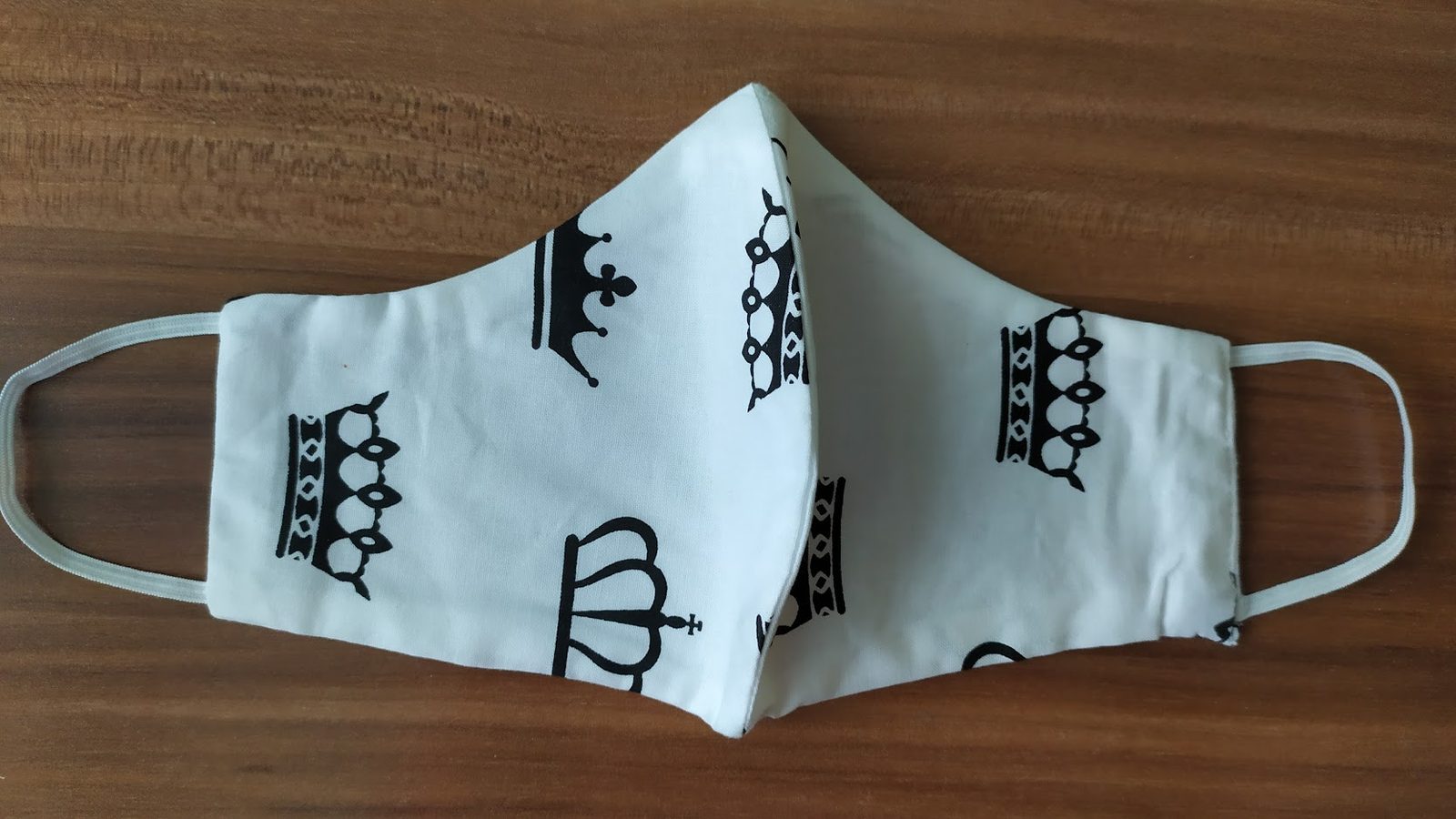 Dvouvrstvá bavlněná bílá rouška s potiskem královských korun, na gumičku za uši.