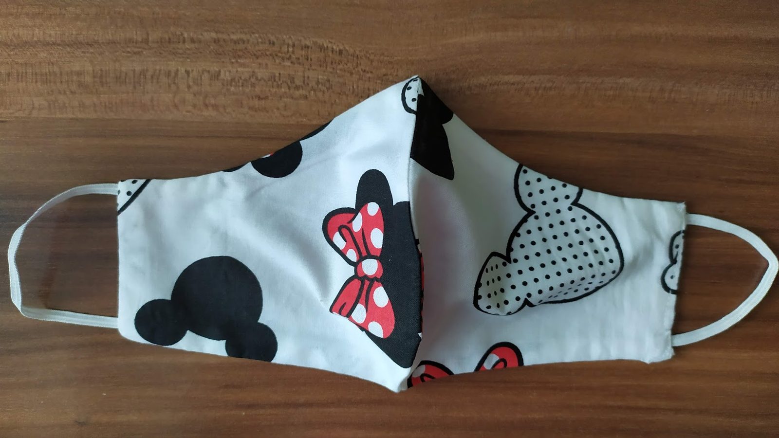 Dvouvrstvá bavlněná rouška pro ženy na gumičku za uši. Bílá rouška s potiskem Minnie a Mickey Mouse.