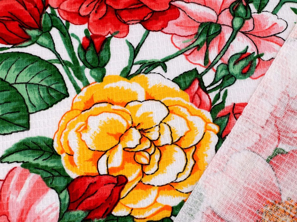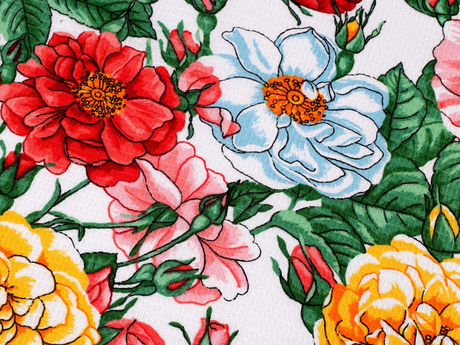 Bavlněné piké s květy růží vyniká snadnou údržbou a odolností. Díky vaflové struktuře má vysokou savost. Využijete ho na šití utěrek, ručníků, zástěr, chňapek, běhounů nebo prostírání. Má design s nekonečným vzorem.
