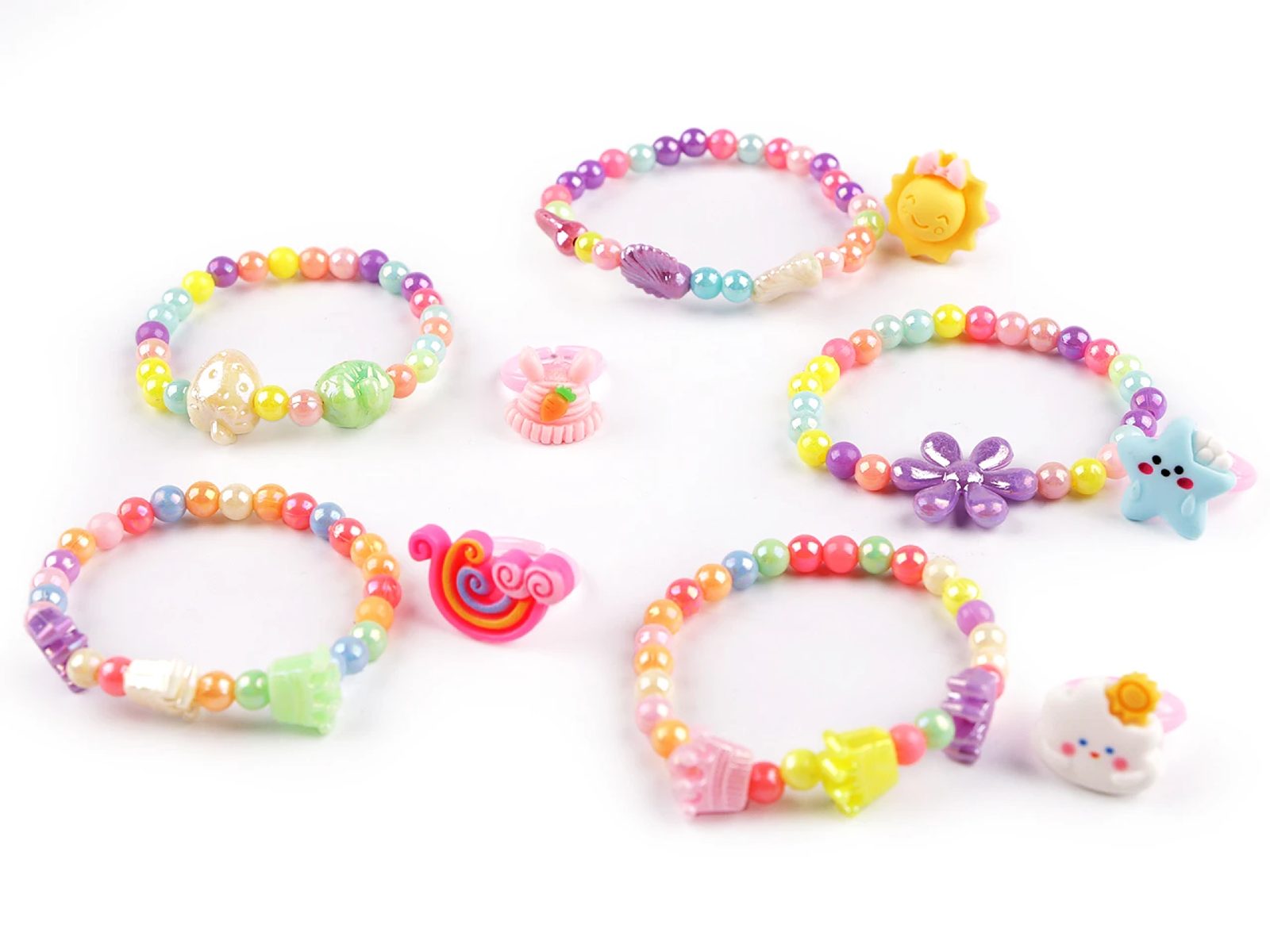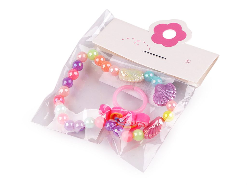 Dětská sada roztomilých šperků z plastových korálků s perlovým leskem obsahuje náramek a prstýnek.Lesklé korálky na náramku jsou navlečené na pružné gumičce. Náramek je ozdobený většími korálky s různým motivem. Ozdoba na prstýnku je 3D, zadní strana prstýnku je otevřená, má univerzální velikost určenou pro drobné dětské prsty. Náramek nemá uzávěr, je pružný, jde pohodlně navléci.