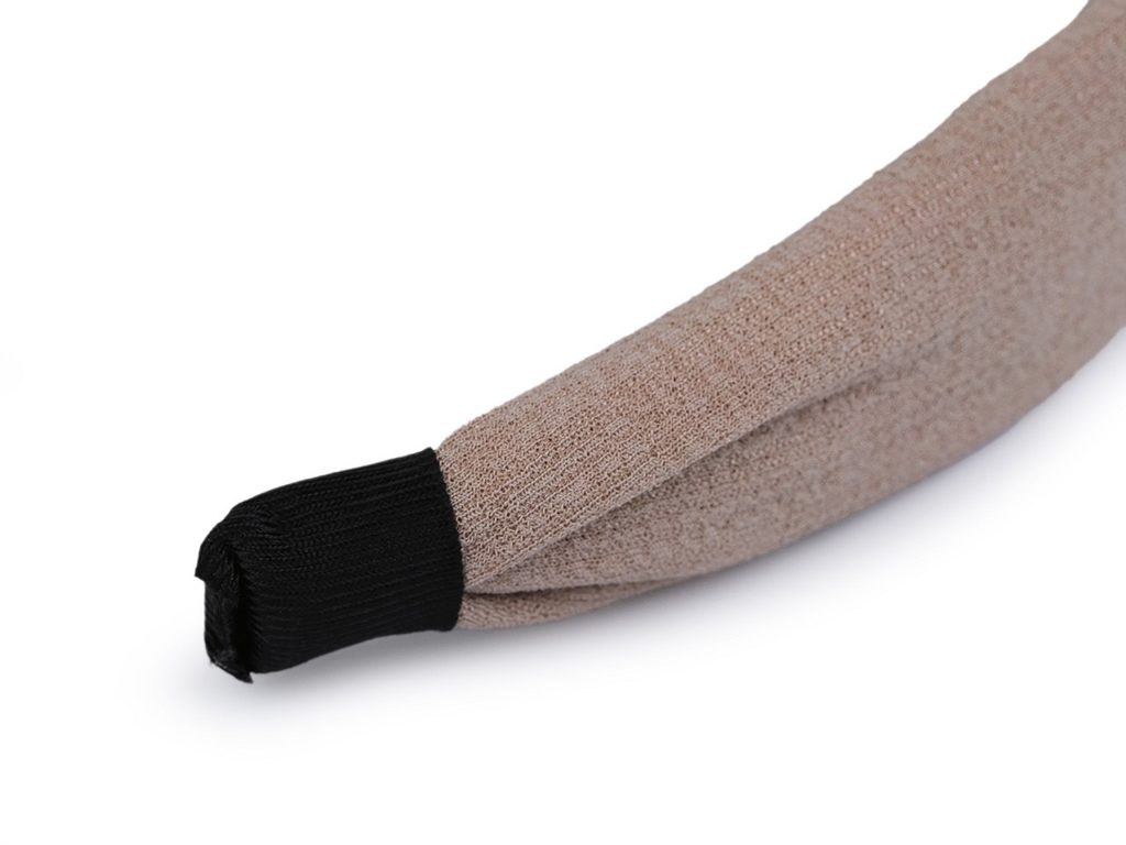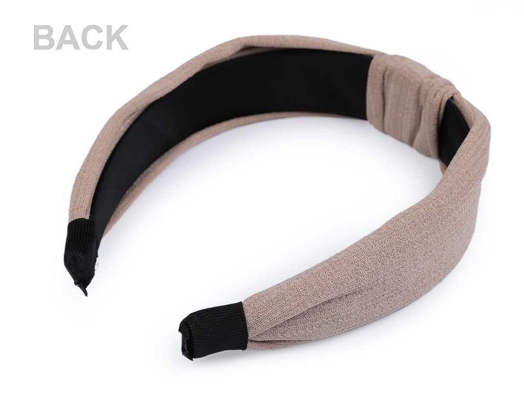 Široká čelenka je ozdobená jednobarevnou látkou se strukturou proužků. Uprostřed je látka spletená do uzlu. Čelenka je elegantní a stylová, využijete ji na běžné nošení i na párty.Vnitřní strana čelenky je potažená saténem, je příjemná na nošení.