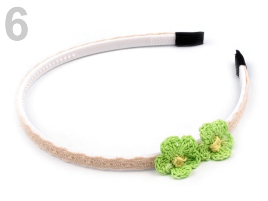 Jemná krajková čelenka s dvěma háčkovanými květy průměru 2,5 cm. Obvod je 39 cm, široká je 8 mm. Každá žena se jako mávnutím kouzelného proutku promění v luční žínku Evelínku. Středy květů jsou žluté. Plastový základ je po celé délce potažený béžovou krajkou z bavlny. Uvnitř této vlasové ozdoby jsou umístěny drobné zoubky, které zajistí, aby čelenka z vlasů neklouzala. Konce jsou obaleny látkou, aby netlačily.Podobné produkty z kategorie ČELENKY ►