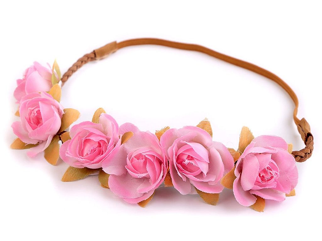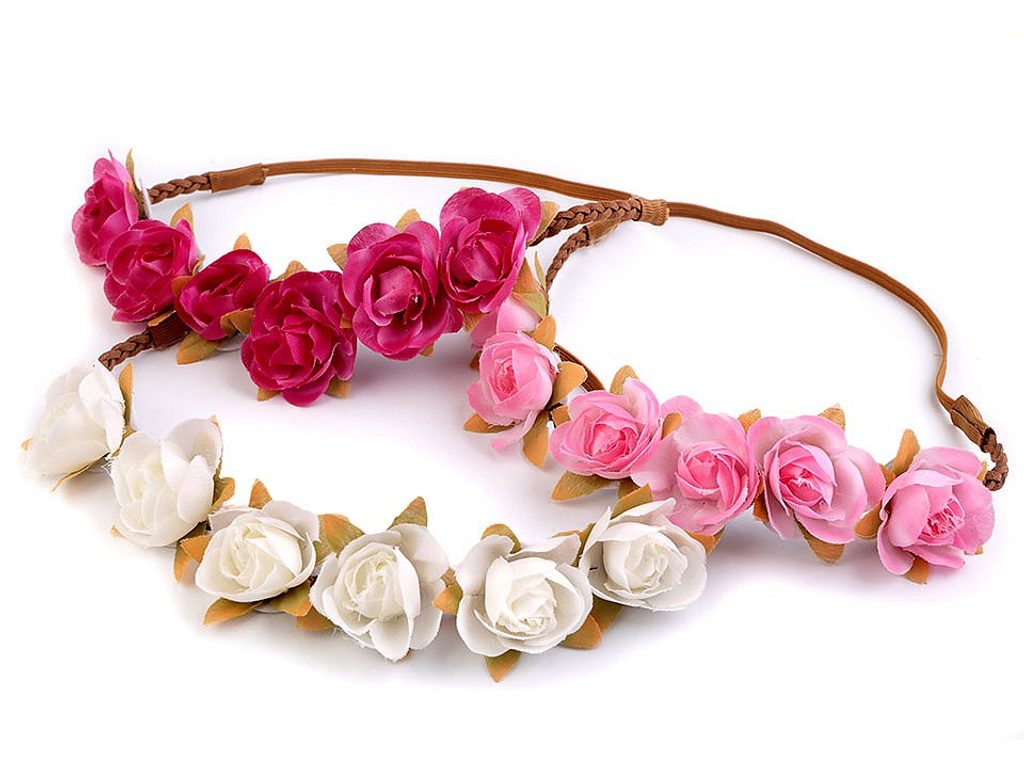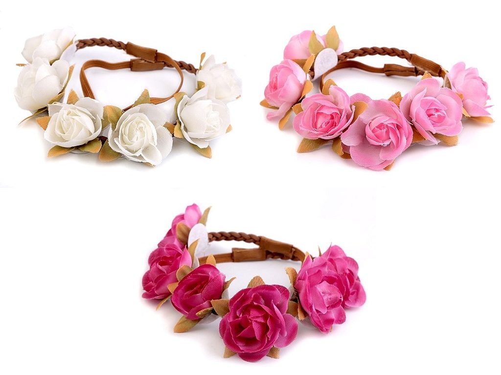 Čelenka s květy růží vypadá skvěle v rozpuštěných i zapletených vlasech. Využijí ji i dívky, které čeká První svaté přijímání, neměla by chybět v účesu žádné družičky. Na spleteném copánku z eko kůže jsou připevněné textilní květy. Zadní část tvoří pružná guma. Čelenka pevně drží a nepadá, je velice příjemná na nošení.Celkový obvod čelenky je 46 cm v nenataženém stavu.
