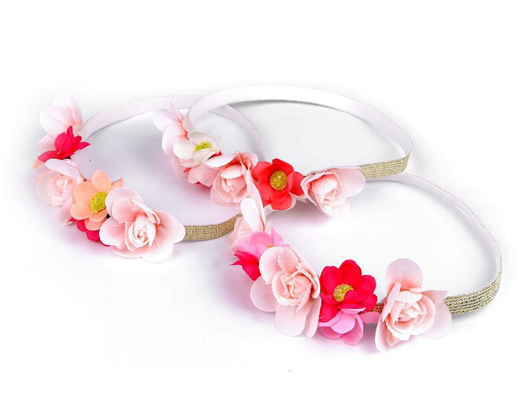 Pružná čelenka s květy je nádherná v rozpuštěných i zapletených vlasech. Využijí ji i dívky, které čeká První svaté přijímání, neměla by chybět v účesu žádné družičky. Textilní květy jsou připevněné na pružné gumě, která se třpytí díky přidanému lurexu. Čelenka pevně drží a nepadá, je velice příjemná na nošení.Celkový obvod čelenky je 44 cm v nenataženém stavu.