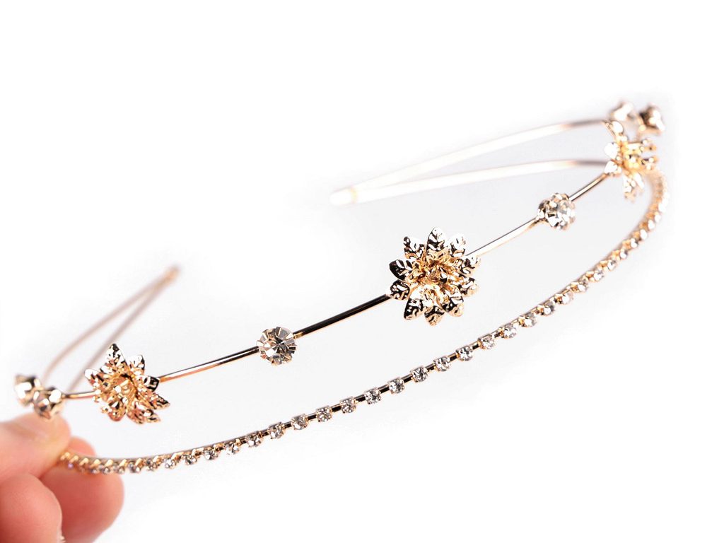 Dvouřadá štrasová čelenka slavnostně dozdobí účes pro jakoukoli příležitost. Vyniká svým rafinovaným designem, který kombinuje jemnost a eleganci. Z kovového drátu je vytvořená konstrukce, na níž jsou pevně připevněná kovová lůžka se skleněnými štrasovými kamínky a květy. Čelenka působí jemným dojmem, díky kamínkům se oslnivě třpytí. Dá se kombinovat s různými druhy účesů, od uvolněných kadeří po elegantní drdoly.- Materiál: bižuterní kov s galvanizací, sklo