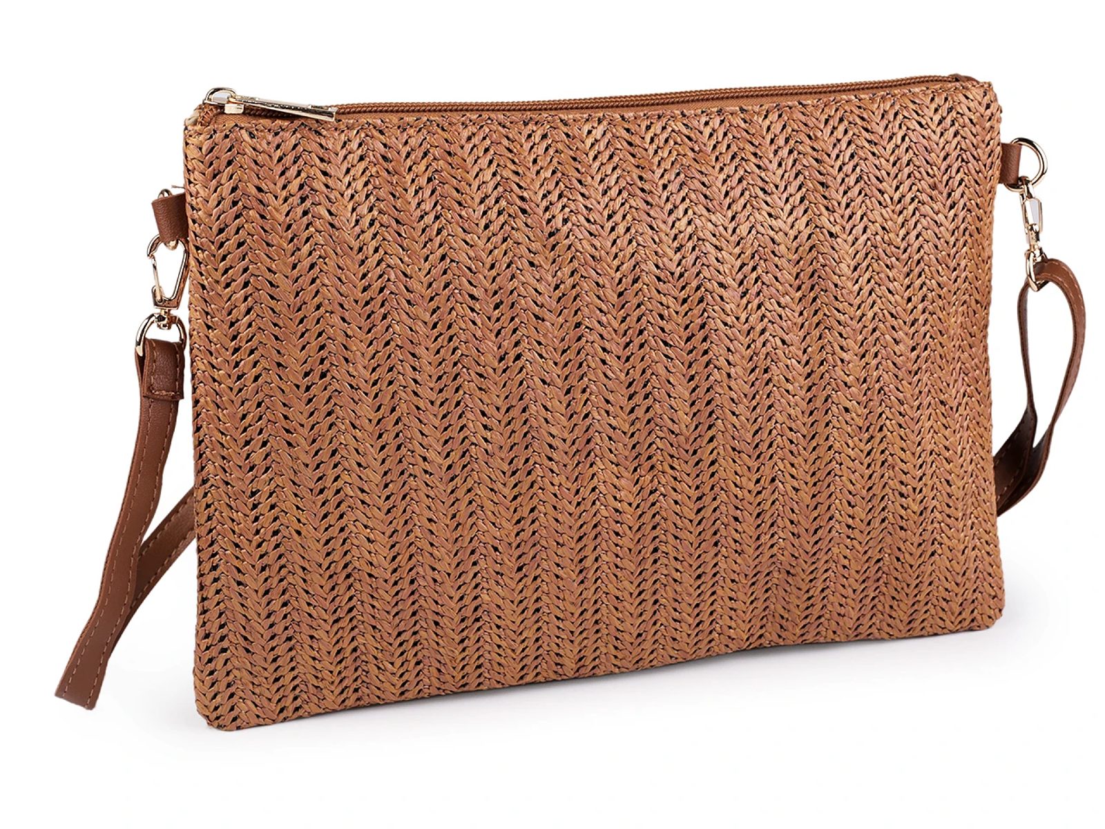 Kabelka s potahem imitujícím slámu je zajímavým módním doplňkem v boho stylu. Je lehká jako peříčko. Zavírá se na zip, uvnitř má kapsičku na drobnosti na zip. Součástí kabelky je nastavitelný popruh, kabelku můžete nosit jako crossbody přes rameno či do kříže. Kabelka disponuje i odepínacím poutkem do ruky.Taška je zabalená v ochranném obalu z netkané textilie.