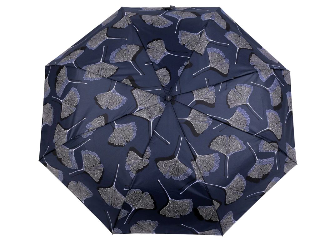 Dámský skládací deštník zaujme svým potahem s listy ginkgo. Rozevírá se stisknutím tlačítka na rukojeti. Rukojeť je plastová, opatřená poutkem. Deštník je velice pevný, odolá náporům větru. UV filtr vás ochrání před slunečním zářením. Konstrukce deštníku se skládá z osmi polí. Součástí deštníku je ochranný obal.Hloubka deštníku je 20 cm.
