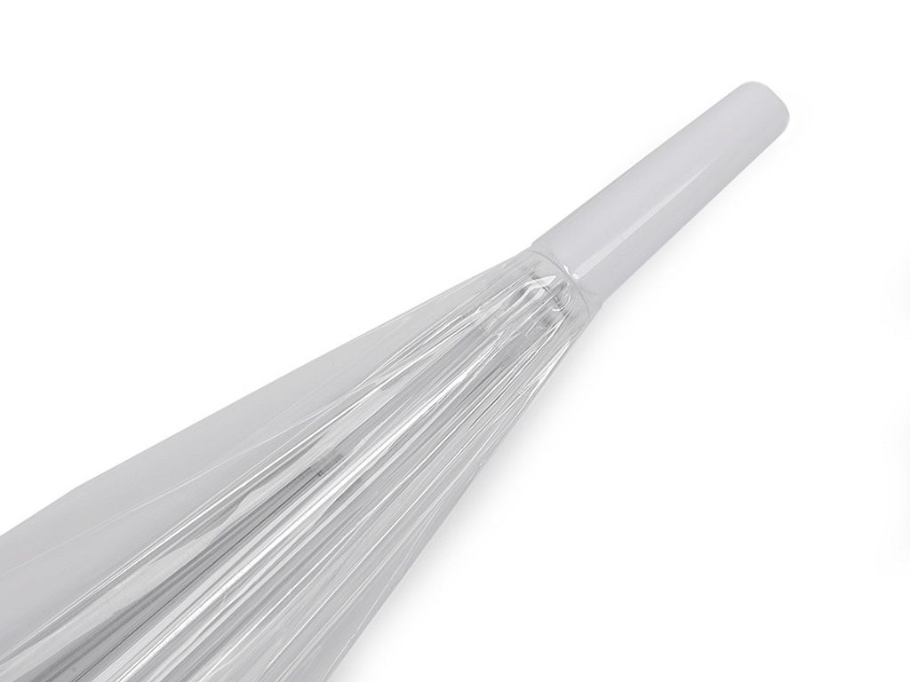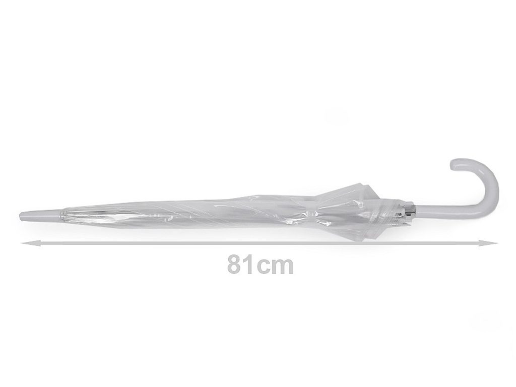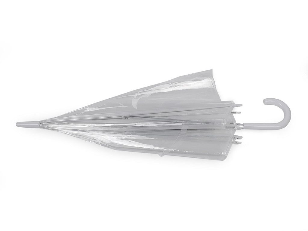 Dámský průhledný deštník je vyrobený z pevného materiálu. Je hluboký, jeho průhledný design umožňuje lepší výhled, bez omezující clony deštníku. Deštník je vystřelovací, má klasickou tyč zakončenou pevnou rukojetí. Konstrukce deštníku je z kovového drátu a tvoří osm polí. Dráty jsou zakončené plastovými kuličkami - zmenšují riziko poranění. Deštník má klasické zapínání na patentku.Hloubka deštníku je 27 cm.