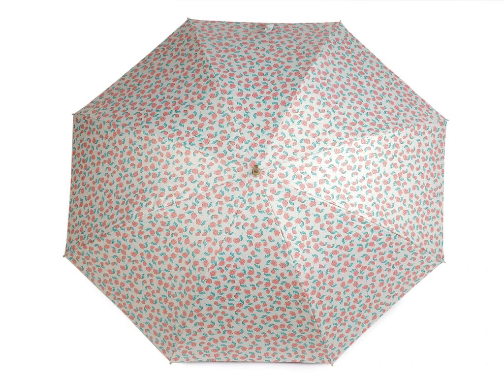 Velký dámský deštník s potiskem malých květů je vystřelovací, konstrukci má z kovového drátu a pružných lamel, které tvoří osm polí. Díky nim je velice pevný, neohne se ani za největšího nečasu. UV filtr vás ochrání před slunečním zářením. Klasická tyč je zakončená pevnou rukojetí z eko kůže. Dolní strana potahu je černá.Hloubka deštníku je 24 cm.