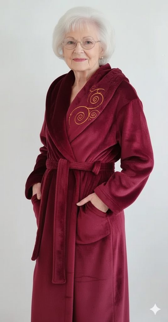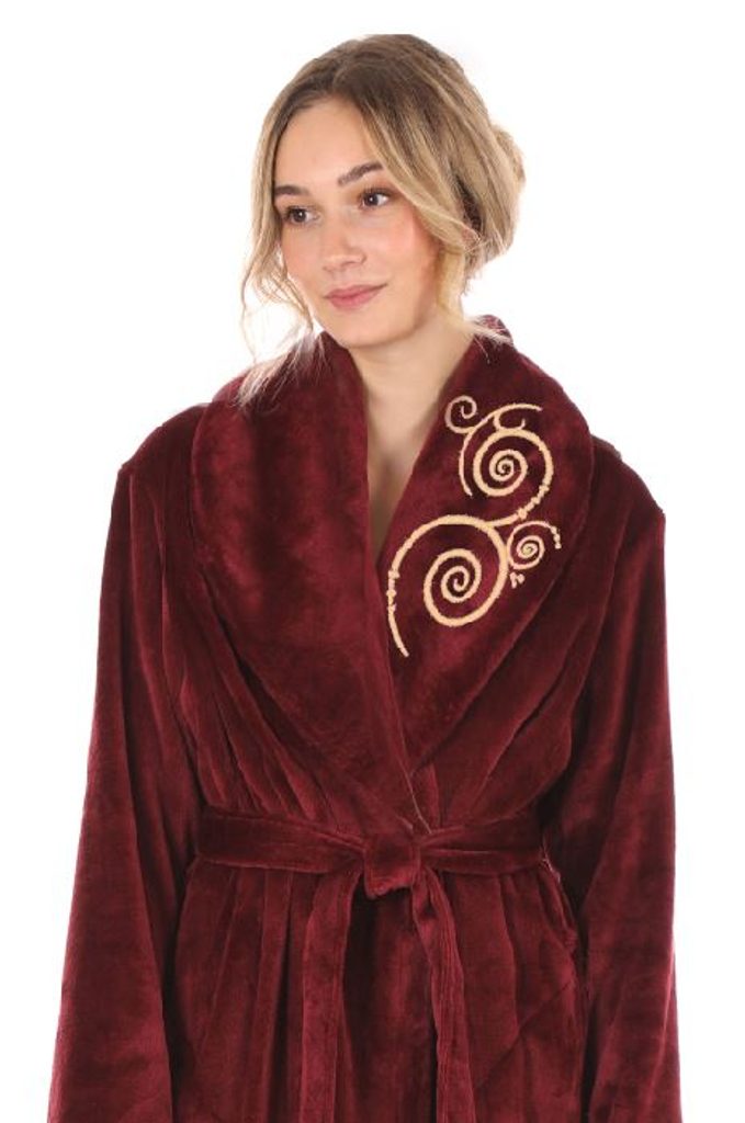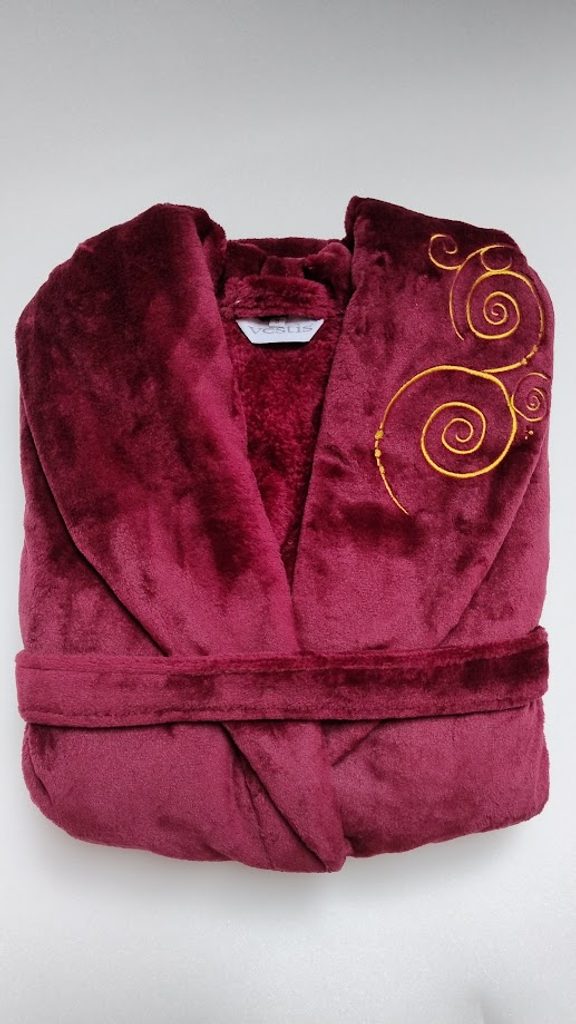 Oblíbená vínová barva a límec s výšivkou dodávají županu jedinečný charakter, zatímco kapsy a pás umožňují praktické nošení.