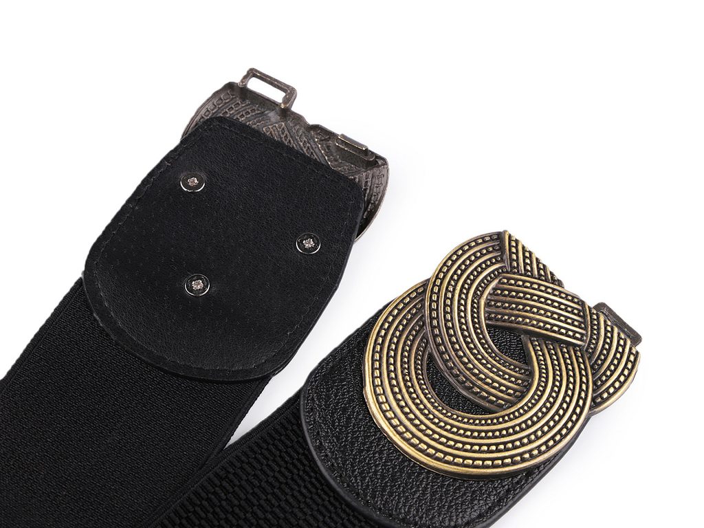 Pružný dámský pásek je vhodný pro nošení k šatům, tunikám apod. Vyniká svou velkou šířkou, má výraznou elegantní sponu, která se zapíná na háčky a očka.Nejmenší obvod zapnutého pásku je 64 cm.