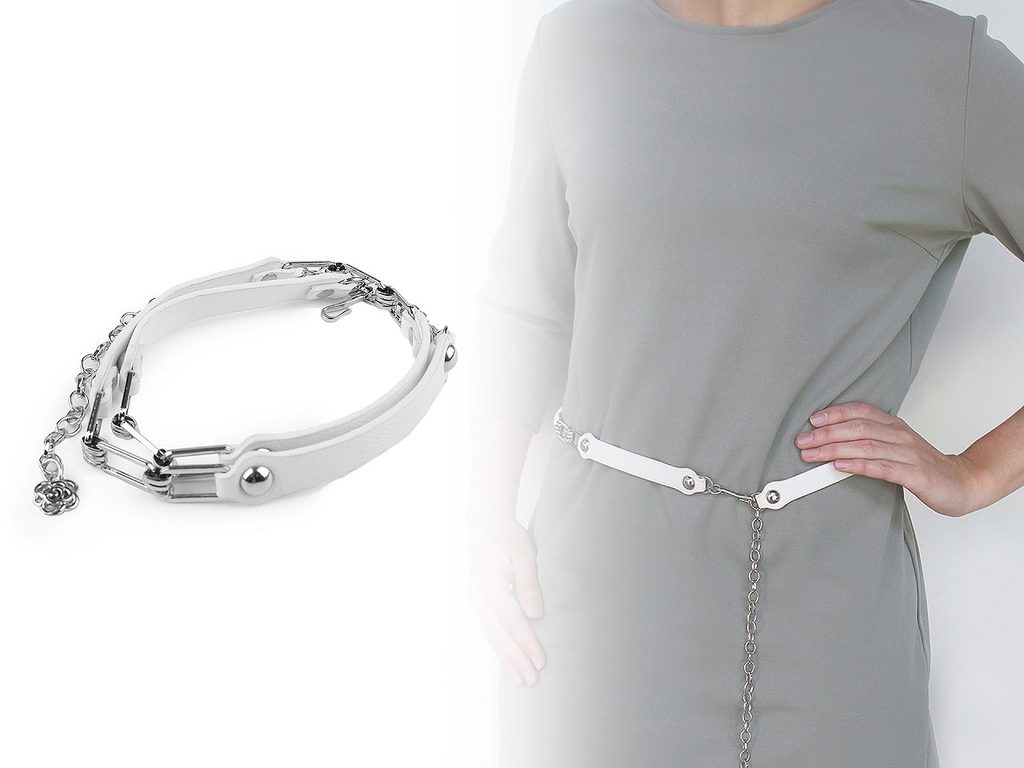 Dámský kombinovaný pásek patří k poutavým módním doplňkům. Části imitující kůži se střídají s kovovými oky. Využijete jej k šatům, tunikám apod. Zapíná se na řetízek a háček. Na konci řetízku je přívěsek růže.