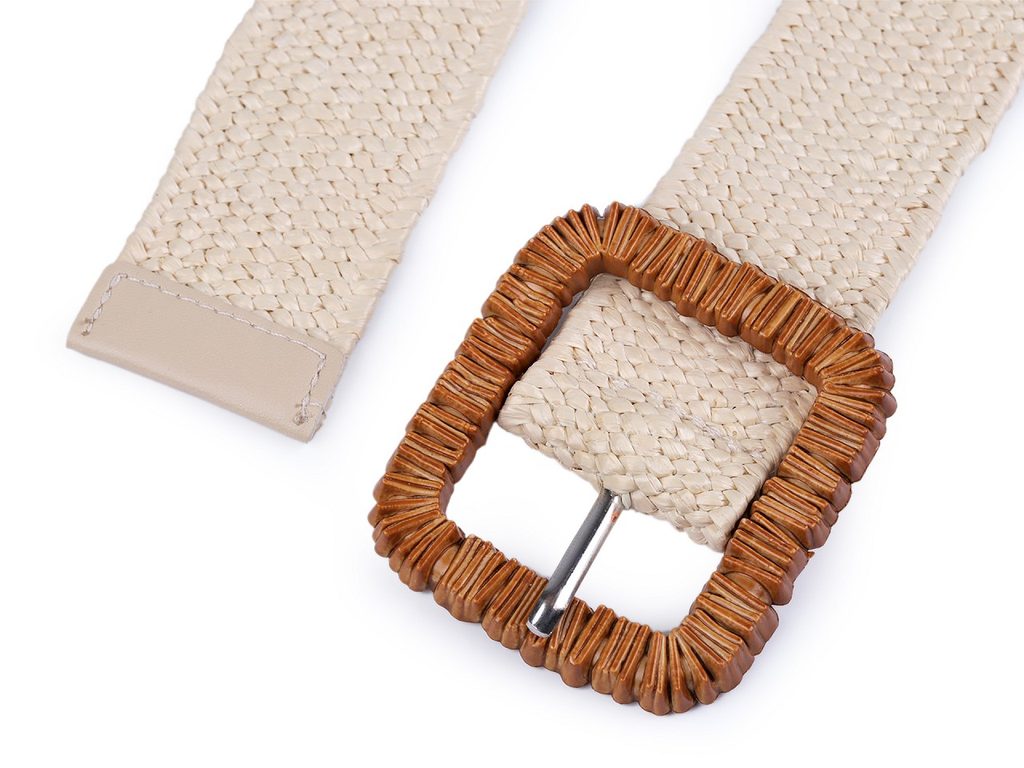 Pružný pásek je velice praktický. Má zajímavou strukturu z navzájem propletených pruženek a imitace juty. Klasická spona na zapnutí, která je zdobená reliéfem připomínajícím dřevo, se díky síťované struktuře pásku dá zapnout v jakékoliv délce.Největší obvod zapnutého pásku je 95 cm.