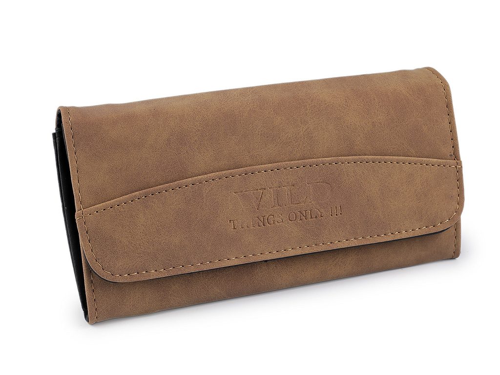 Dámská peněženka z broušené eko kůže má elegantní nadčasový design. Stane se vaší oblíbenou společnicí, snadno ji sladíte s jakýmkoliv stylem oblečení.Zavírá se na klopu a patent. Peněženka má celkem 4 přihrádky na karty, z nichž jedna je průhledná. Za ní jsou umístěné 2 dlouhé přihrádky, jedna z nich je na zip. Uprostřed peněženky se nachází 3 kapsy na bankovky, oddělené přepážkami. Vlevo je rozkládací mincovník rozdělený přepážkou na dva oddíly. Uzavírá se na zip.