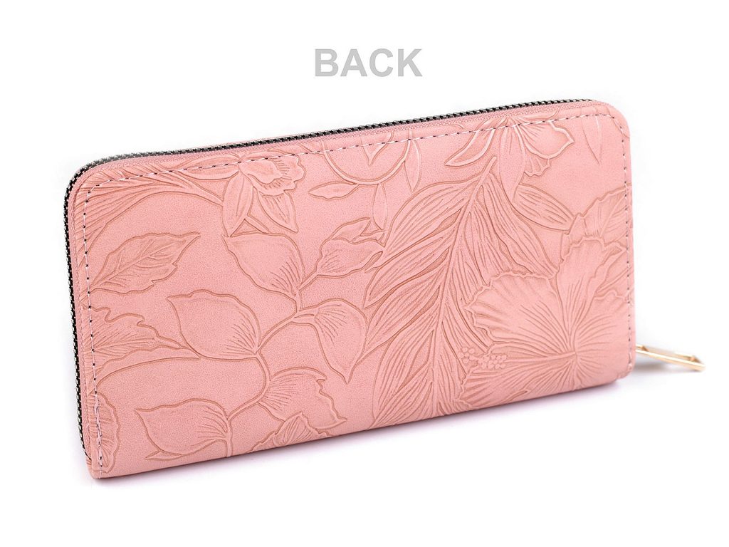 Dámská peněženka vás na první pohled zaujme svým potahem s reliéfem 3D květů. Je velice příjemná na dotek.Peněženka obsahuje jednu hlavní kapsu, která se zapíná na kovový zip. Je velmi prostorná, vejde se do ní i mobilní telefon. Uvnitř je peněženka členěna do tří velkých přihrádek na papírové bankovky a jedné uzavíratelné kapsy na zip, vhodné k ukládání mincí a různých drobností. Po vnitřních stranách peněženky je rozmístěno osm přihrádek na karty a dvě větší na doklady, účtenky apod.