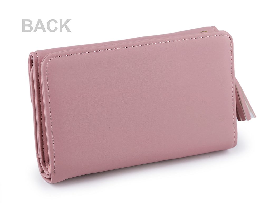 Dámská peněženka s kovovou sponou je velice elegantní. Zip v zadní části má ozdobený střapcem.Přední část peněženky se uzavírá na klopu s kovovým zapínáním. Uvnitř je 9 přihrádek na kreditní karty, 1 průhledná přihrádka na doklady a dlouhé přihrádky na bankovky. Mincovník v zadní části peněženky se zapíná na zip, uvnitř je přepážkou rozdělený na 2 kapsy.