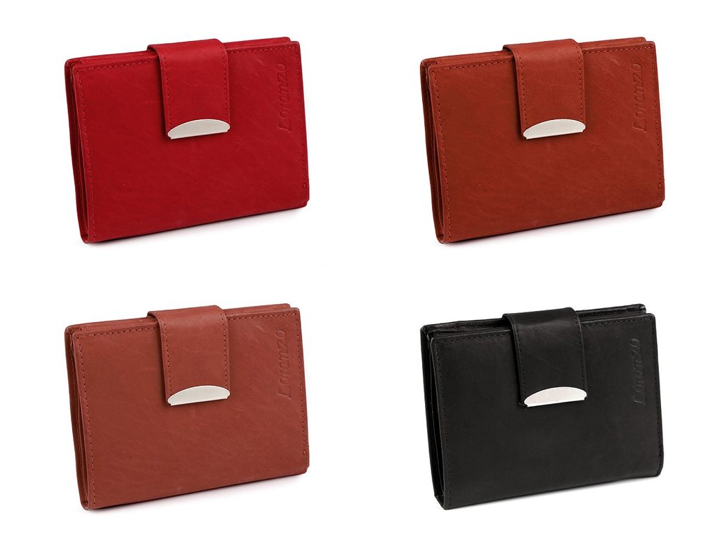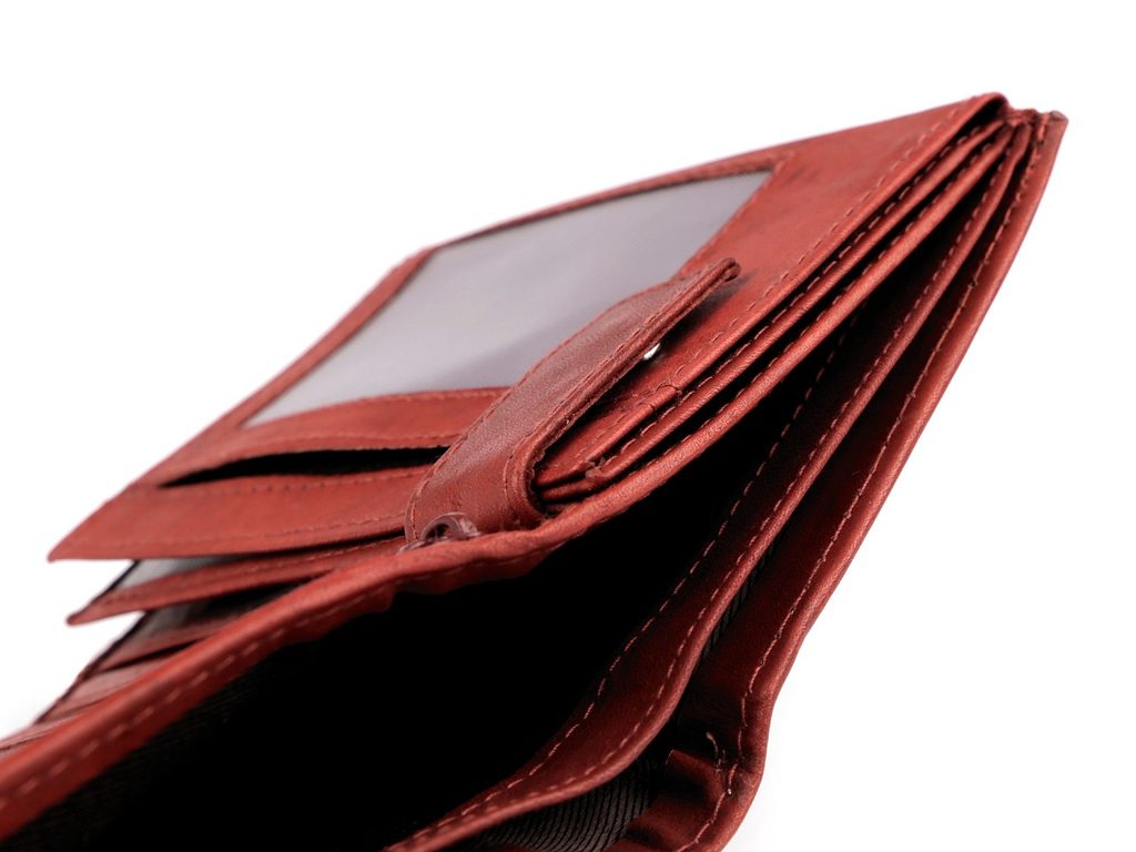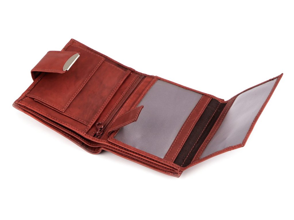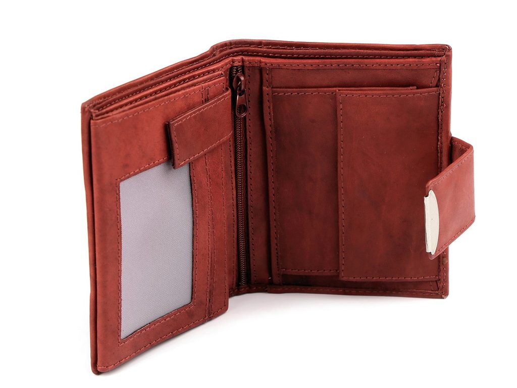Malou dámskou peněženku z pravé kůže si zamilujete na první pohled. Má velice kvalitní provedení a chytrý design, je lehká a příjemná na dotek.Uzavírá se na zápinku a 2 patenty. Po otevření je na pravé straně umístěný mincovník. Má tvar rozkládací kapsy, zapíná se na klopu na patentku. Levá strana peněženky je také zapnutá zápinkou, po jejím otevření se objeví 12 přihrádek na kreditní karty nebo doklady, z toho 3 jsou průhledné. Za všemi těmito přihrádkami a mincovníkem jsou umístěné 2 dlouhé přihrádky na rozložené bankovky. Uprostřed peněženky je ještě 1 skrytá kapsa se zapínáním na zip.