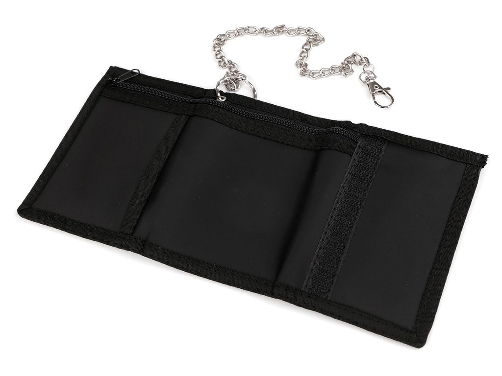 Pánskou textilní peněženku s potiskem si oblíbí všichni skejťáci a rebelové. Díky kovovému řetízku s karabinou si ji mohou připnout ke kalhotám a nosit v kapse. Je pěkně a přehledně uspořádaná, příjemně lehká.Peněženka se uzavírá na suchý zip. Uvnitř jsou 4 přihrádky na kreditní karty nebo doklady, z toho je 1 průhledná, 1 dlouhá přihrádka na rozložené bankovky. Mincovník se zapíná na zip. Na zadní straně peněženky je ještě jedna dlouhá kapsa na zip na bankovky. Řetízek je dlouhý 33 cm.